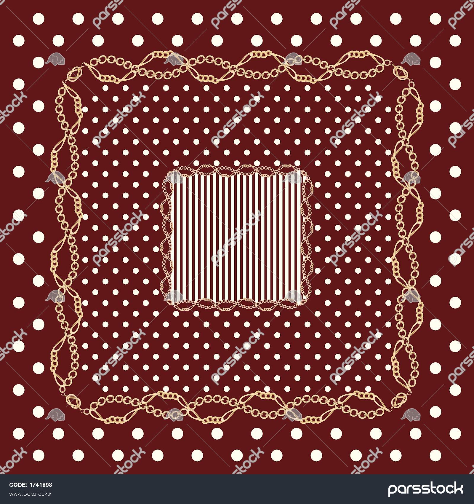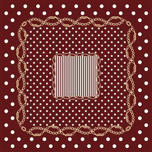 طرح روسری خال‌خالی زرشکی و سفید با حاشیه زنجیر طلایی و کادر راه‌راه کلاسیک