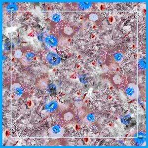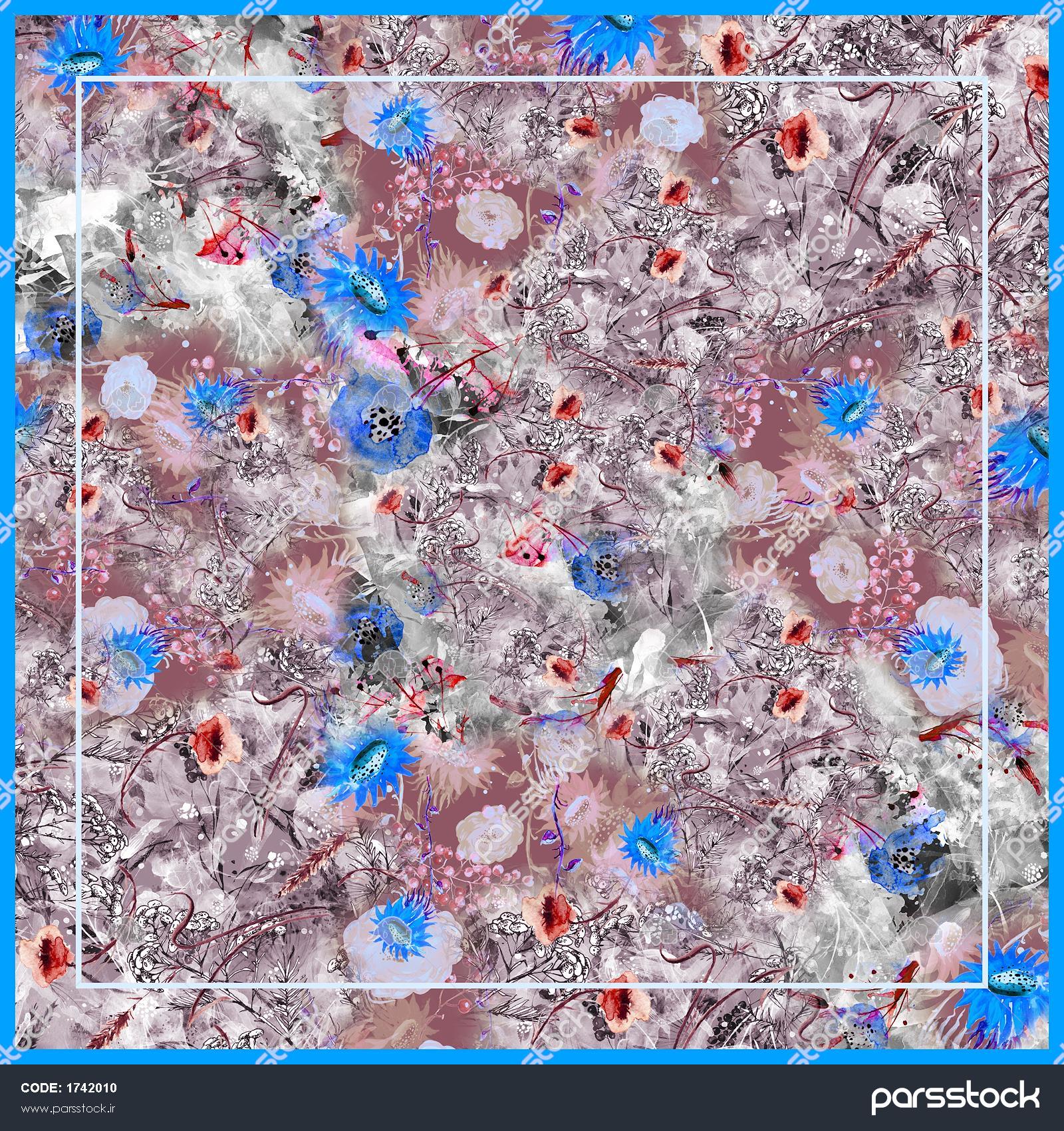 طرح روسری آبرنگی گل‌های آبی و قرمز روی خاکستری (الگوی طبیعت هنری)