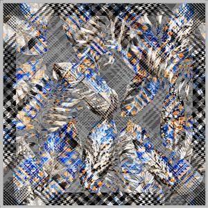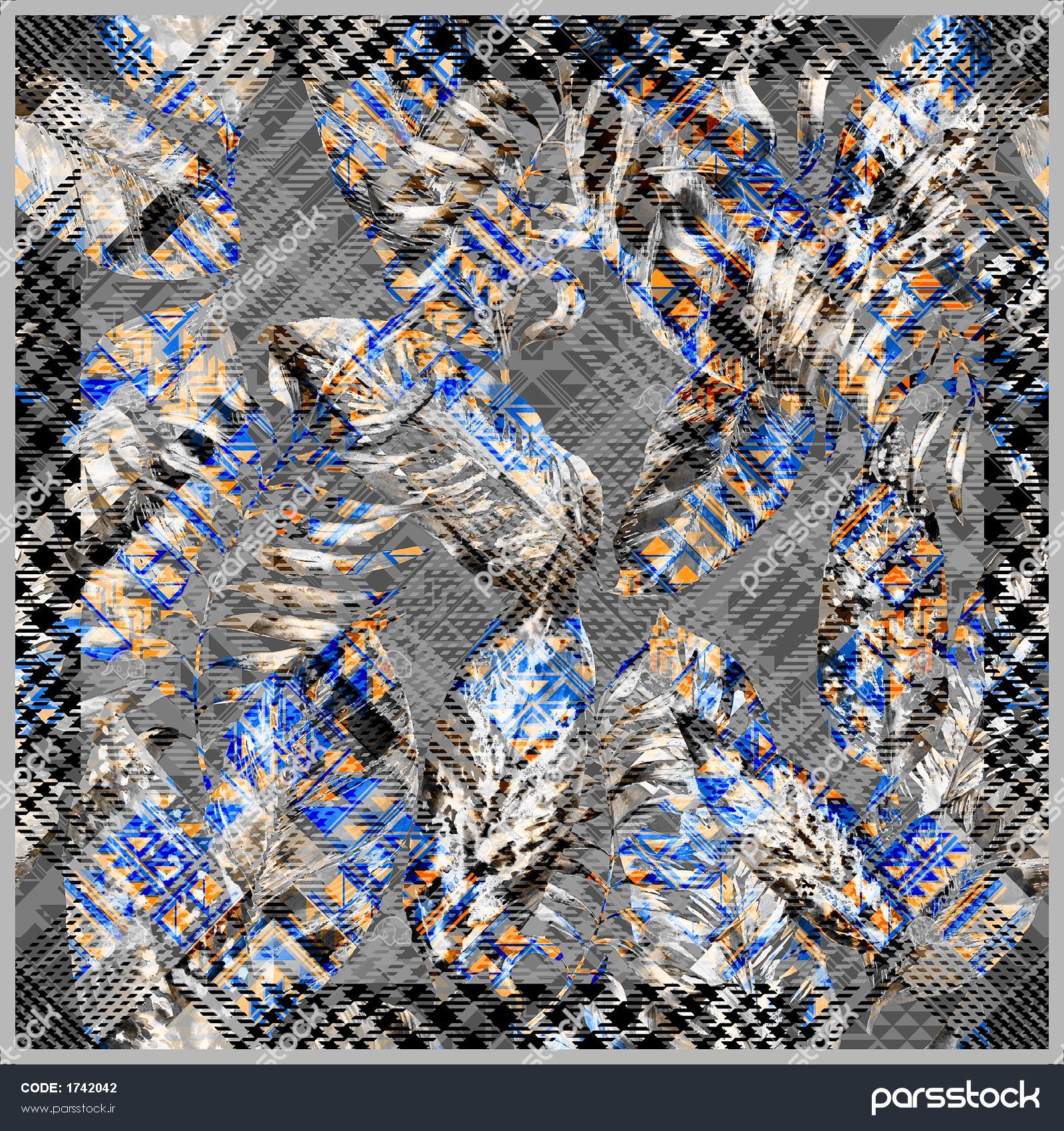 طرح روسری چهارخانه برگ‌دار انتزاعی آبی و نارنجی (طرح شلوغ مدرن)