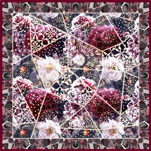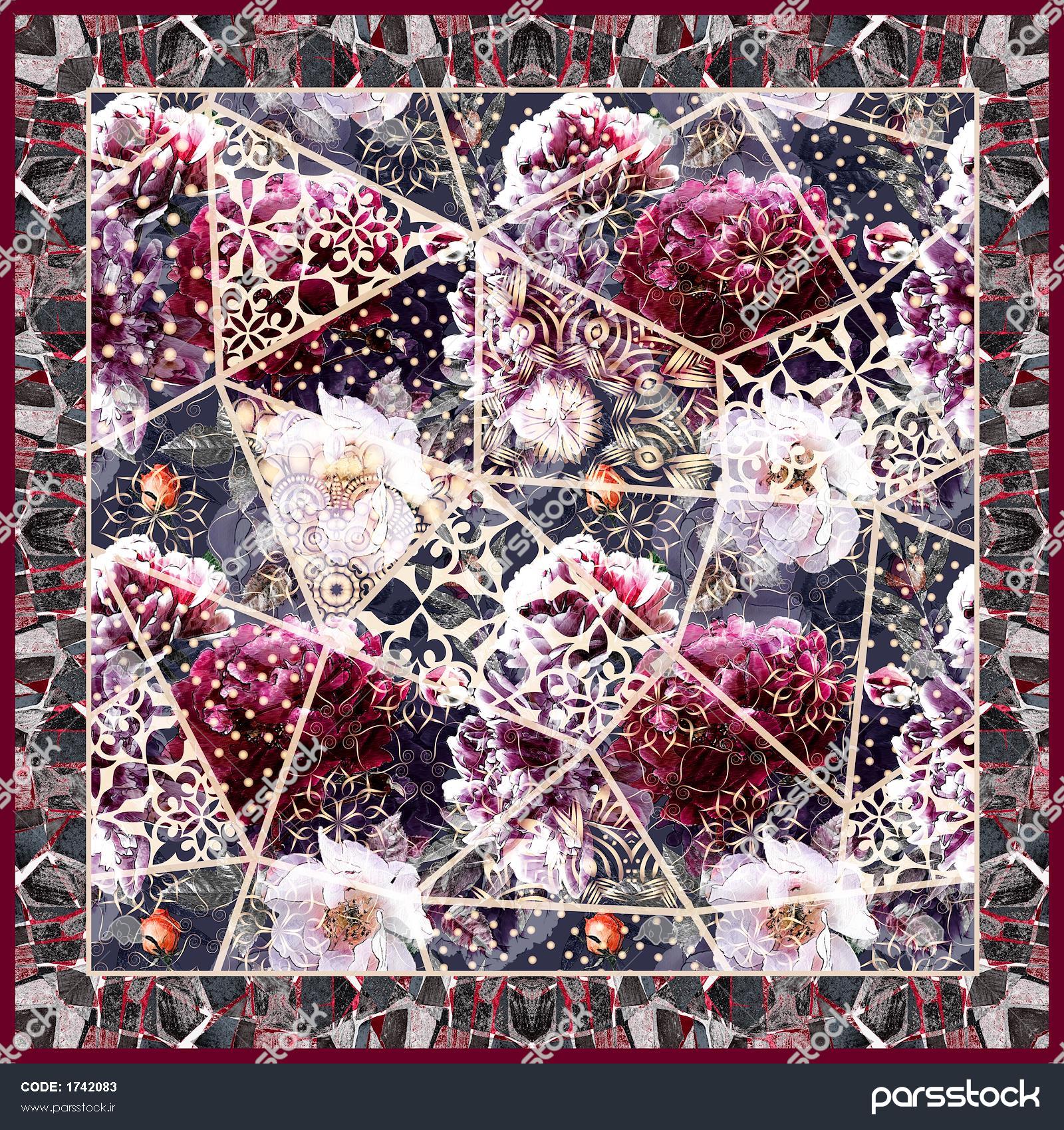 مدل آماده چاپ روسری فشن؛ پچ‌ورک گلدار و هندسی تیره با ترکیب عناصر توری (داماسک)