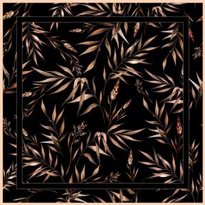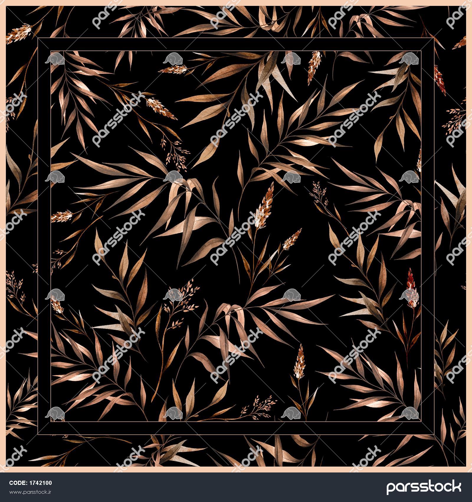 طرح آماده چاپ روسری شال: شاخ و برگ‌های گیاهی تیره و طلایی روی پس زمینه مشکی (طرح کلاسیک)