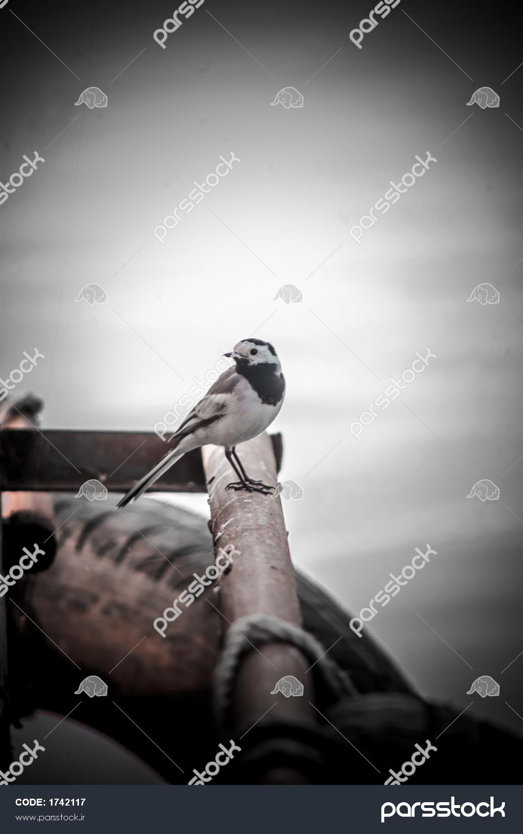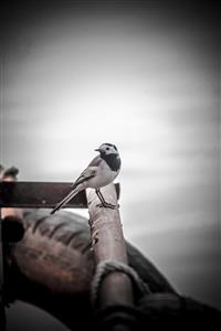 پرنده دم‌جنبانک روی چوب و طناب قایق در پس‌زمینه آسمان روشن نمای کامل پرنده با کنتراست بالا و پس‌زمینه نورانی
