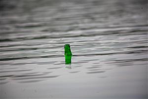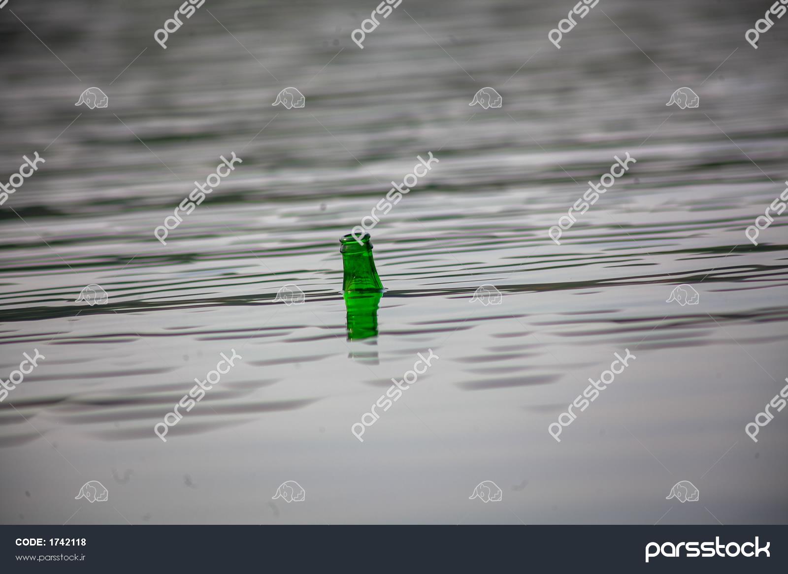 بطری شیشه‌ای سبز شناور در آب دریاچه با موج‌های آرام عکس باکیفیت آلودگی محیط زیست و سطح آب