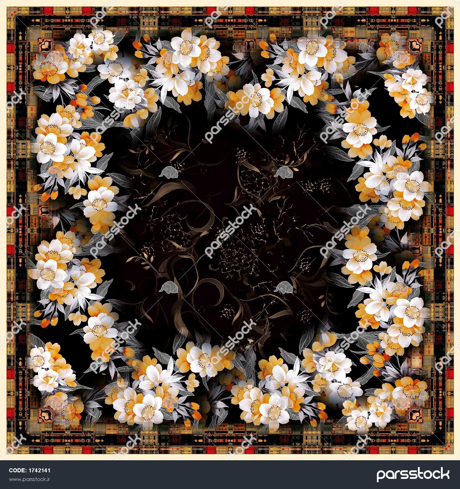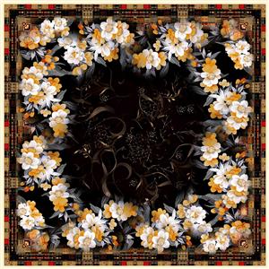 طرح روسری حاشیه گلدار با گلهای سفید و زرد شاد در مرکز مشکی مناسب چاپ با کیفیت