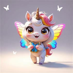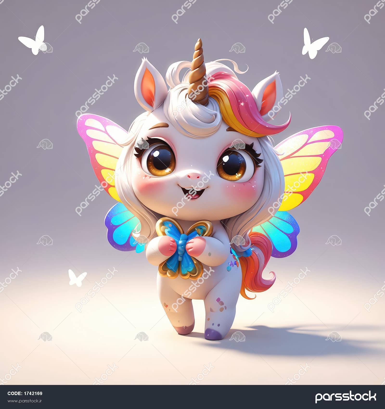 یونیکورن پری بامزه با بال‌های پاستلی و گرفتن پروانه در دست‌ها