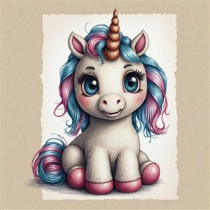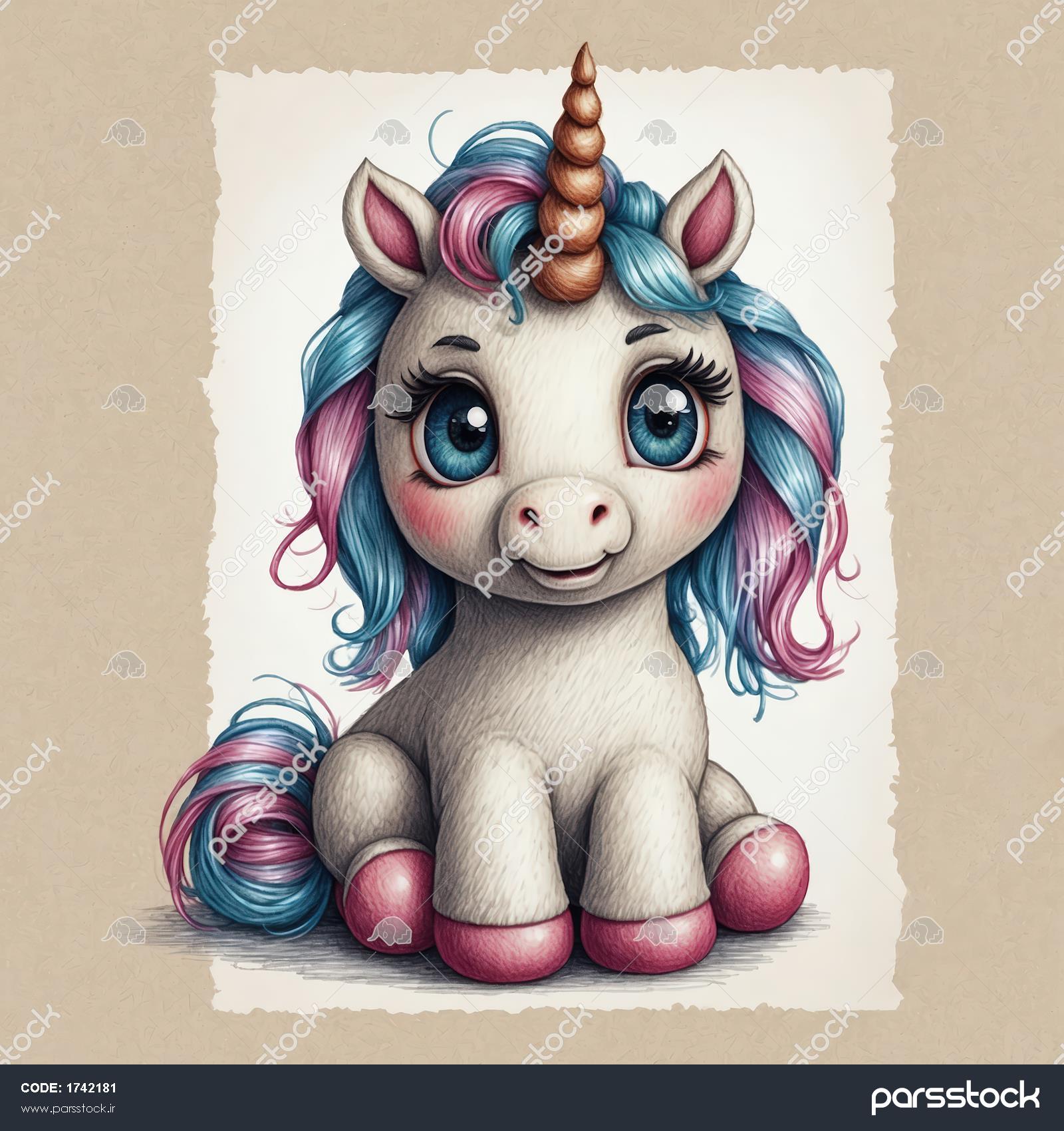 یونیکورن آبرنگی با کادر قدیمی و موهای صورتی و آبی برای طرح‌های وینتج