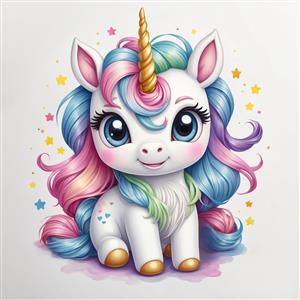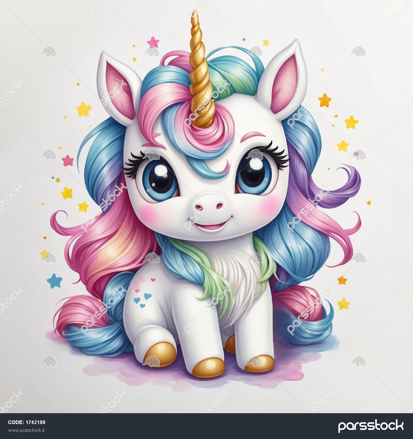 تصویر یونیکورن عروسکی با موهای بافته‌شده رنگین‌کمان و اکلیل‌های طلایی