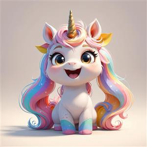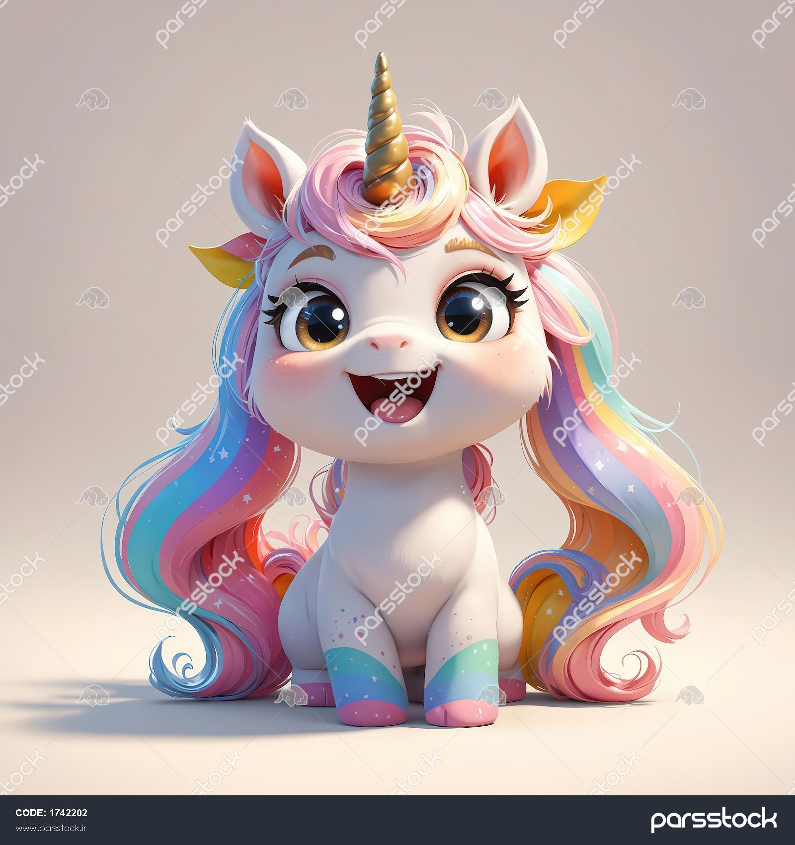 یونیکورن کارتونی خندان با موهای رنگین‌کمانی و چشمان درشت با کیفیت بالا