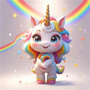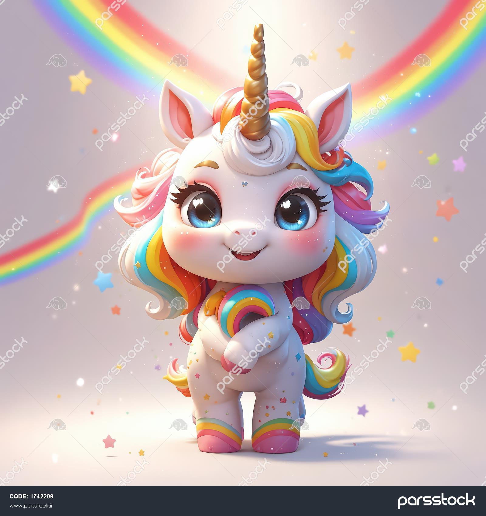 تک‌شاخ شاداب با آغوش باز و رنگین‌کمان، تصویر سه‌بعدی کودکانه برای چاپ عریض و بوم نقاشی