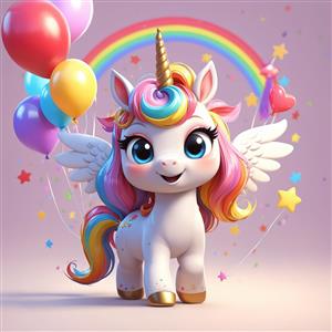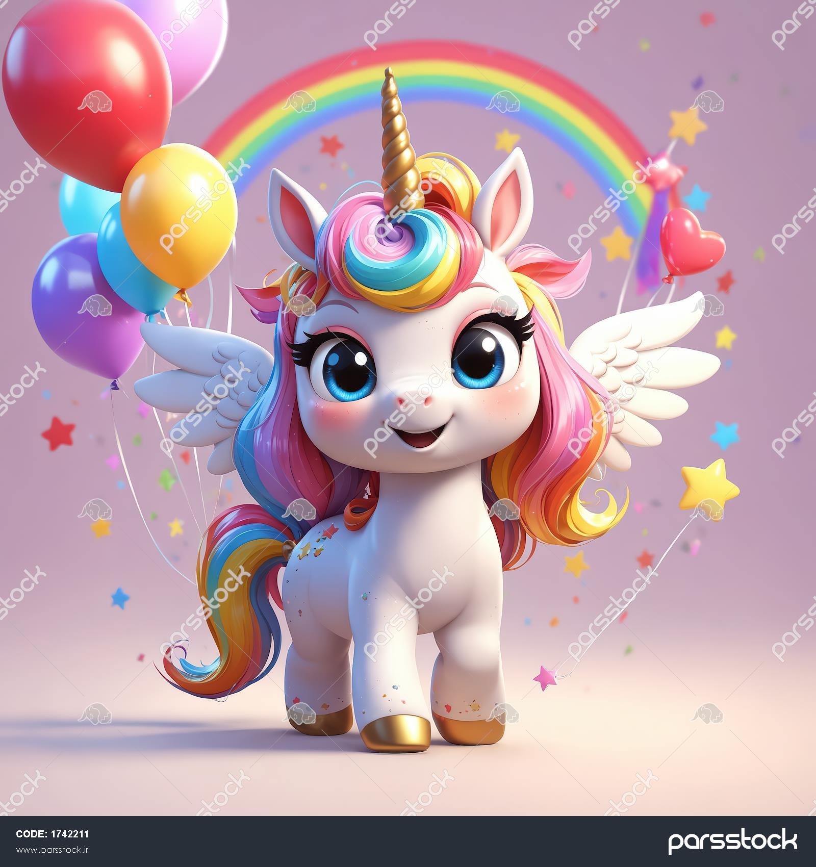 تک‌شاخ پگاسوس جشن با بادکنک‌های رنگی، تصویر شاد و اورجینال برای تابلو دکوراتیو و جشن تولد