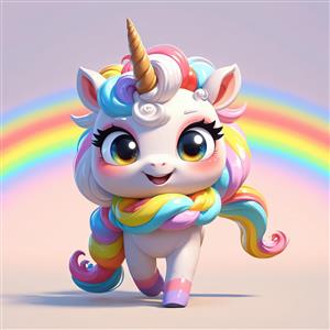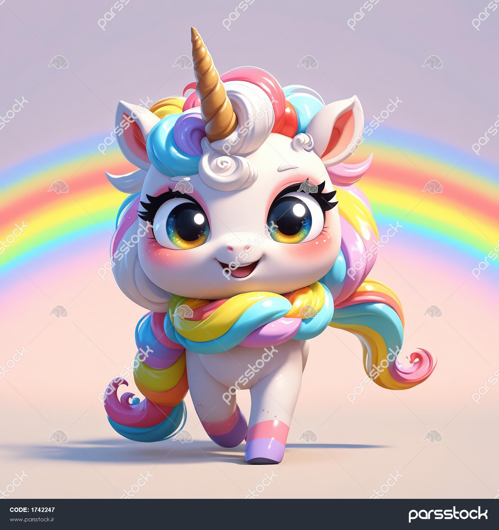 تک‌شاخ در حال دویدن با شال رنگین‌کمانی در پس‌زمینه رنگارنگ، عکس فانتزی برای پوستر عریض و شاد