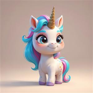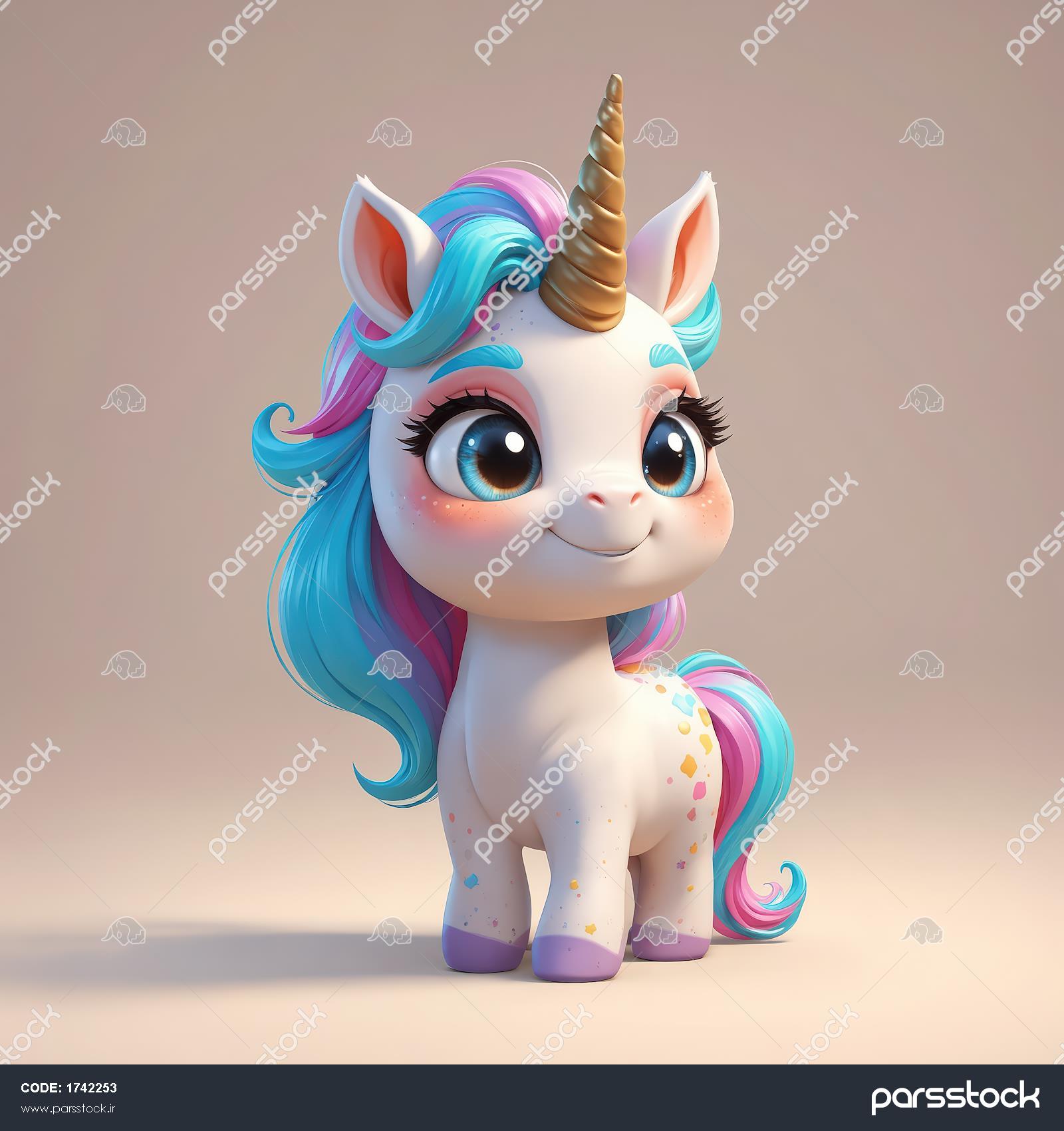 پونی تک‌شاخ دخترانه با یال آبی و صورتی، پس‌زمینه ساده، تصویر باکیفیت بالا برای چاپ پوستر فانتزی