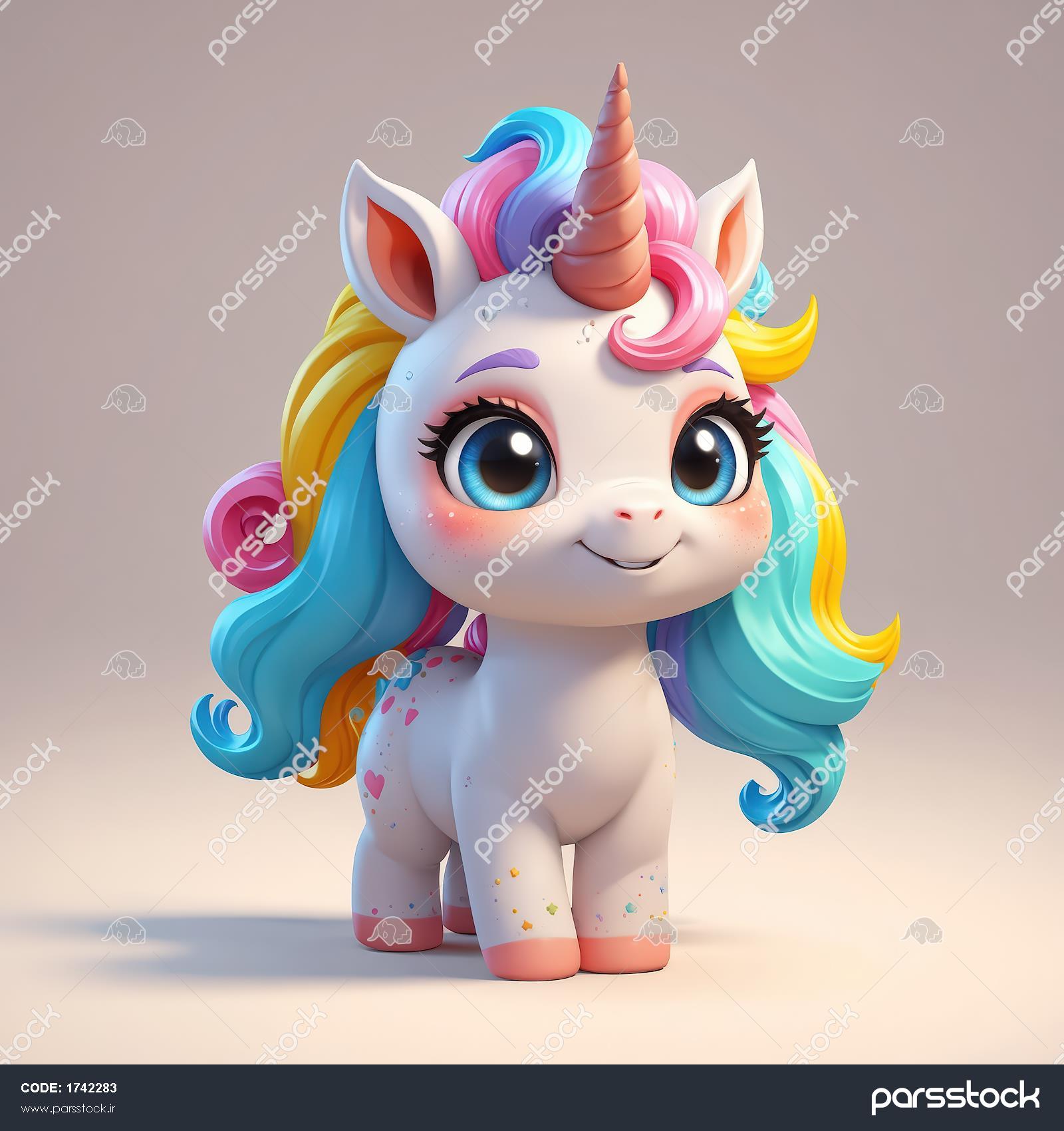 یونیکورن با یال بلند و مواج صورتی، آبی و زرد؛ مناسب چاپ با کیفیت بالا