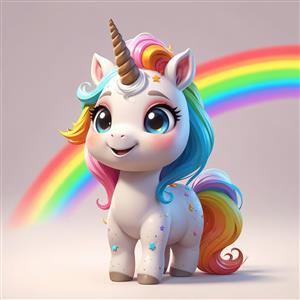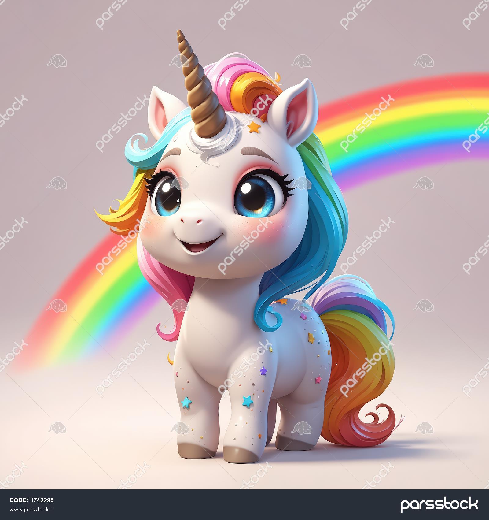 تصویر دکوراتیو یونیکورن خندان با پس‌زمینه رنگین‌کمان و ستاره‌های رنگی