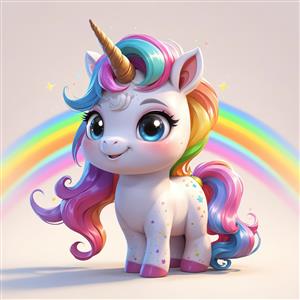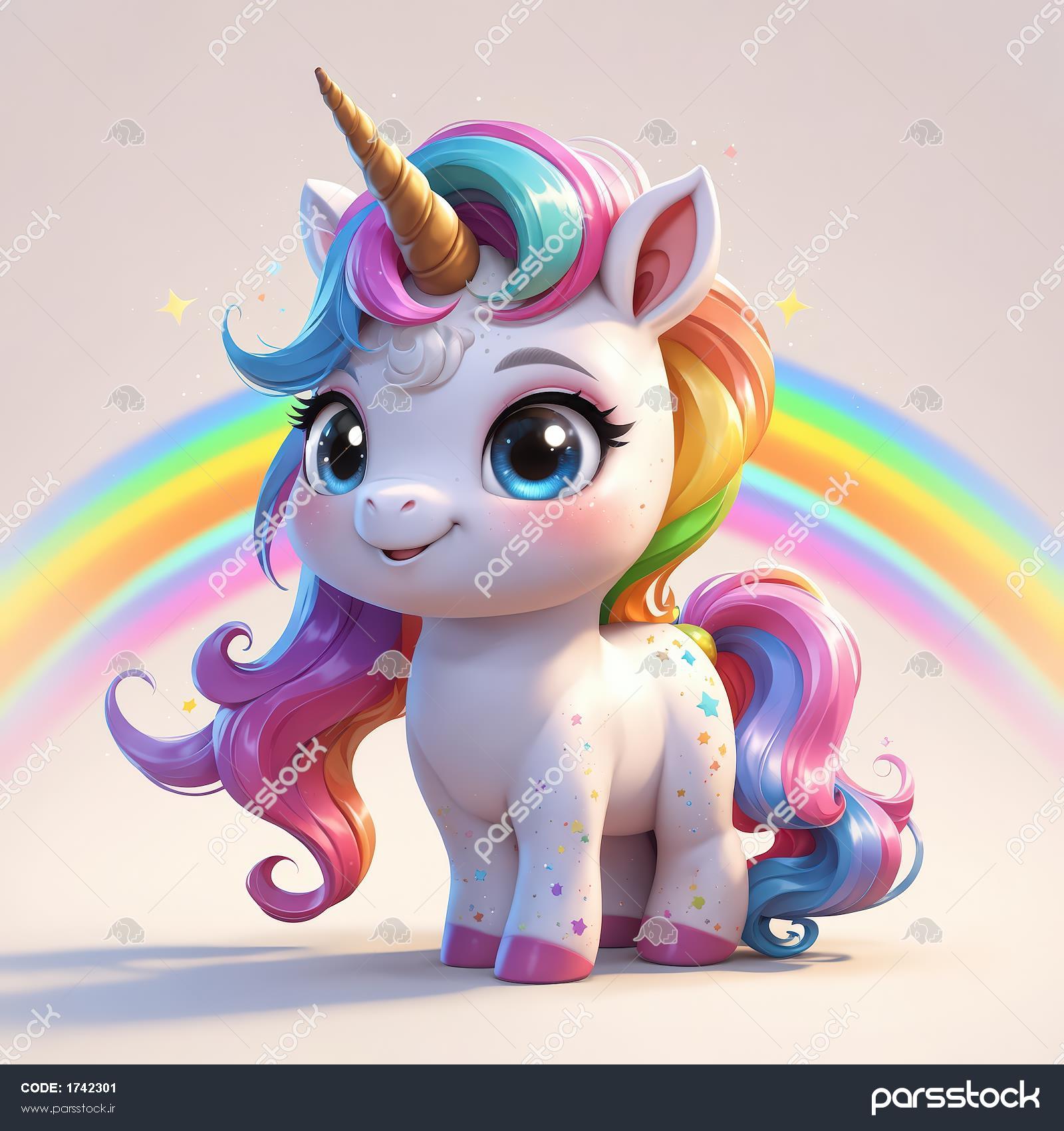 تابلو دکوراتیو یونیکورن با یال رنگارنگ و کمان رنگین‌کمان در پس‌زمینه
