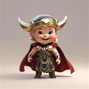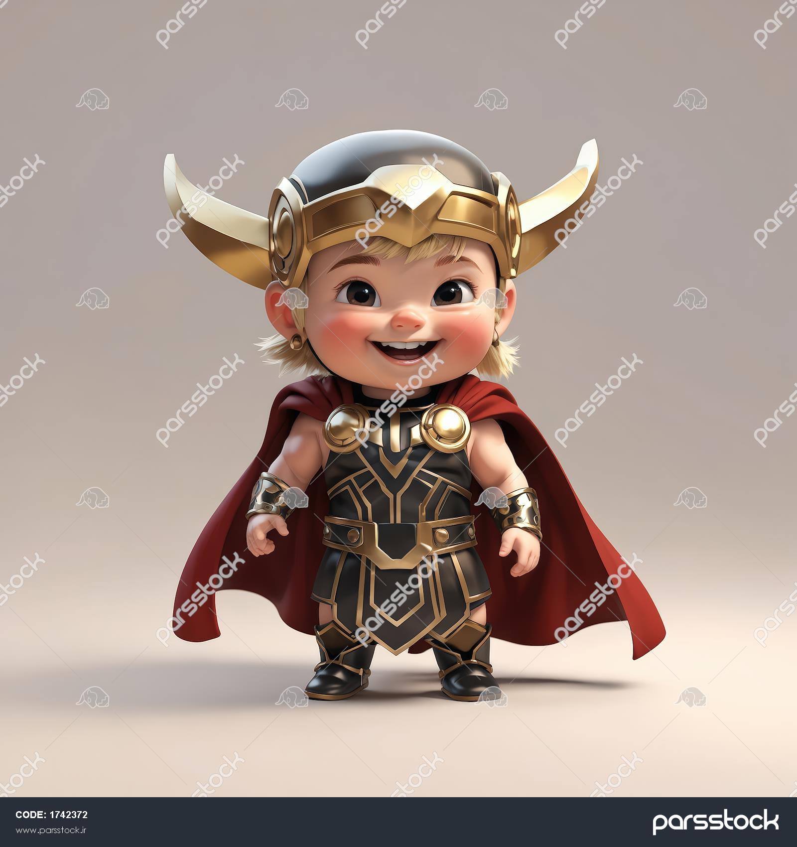 عکس پرتره کودک ثور با کلاه شاخدار مشکی و زره مشکی طلایی با شنل قرمز
