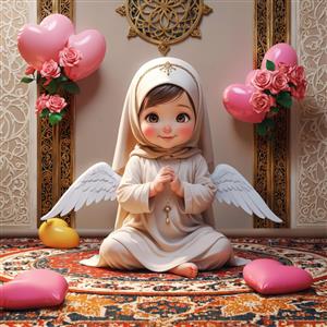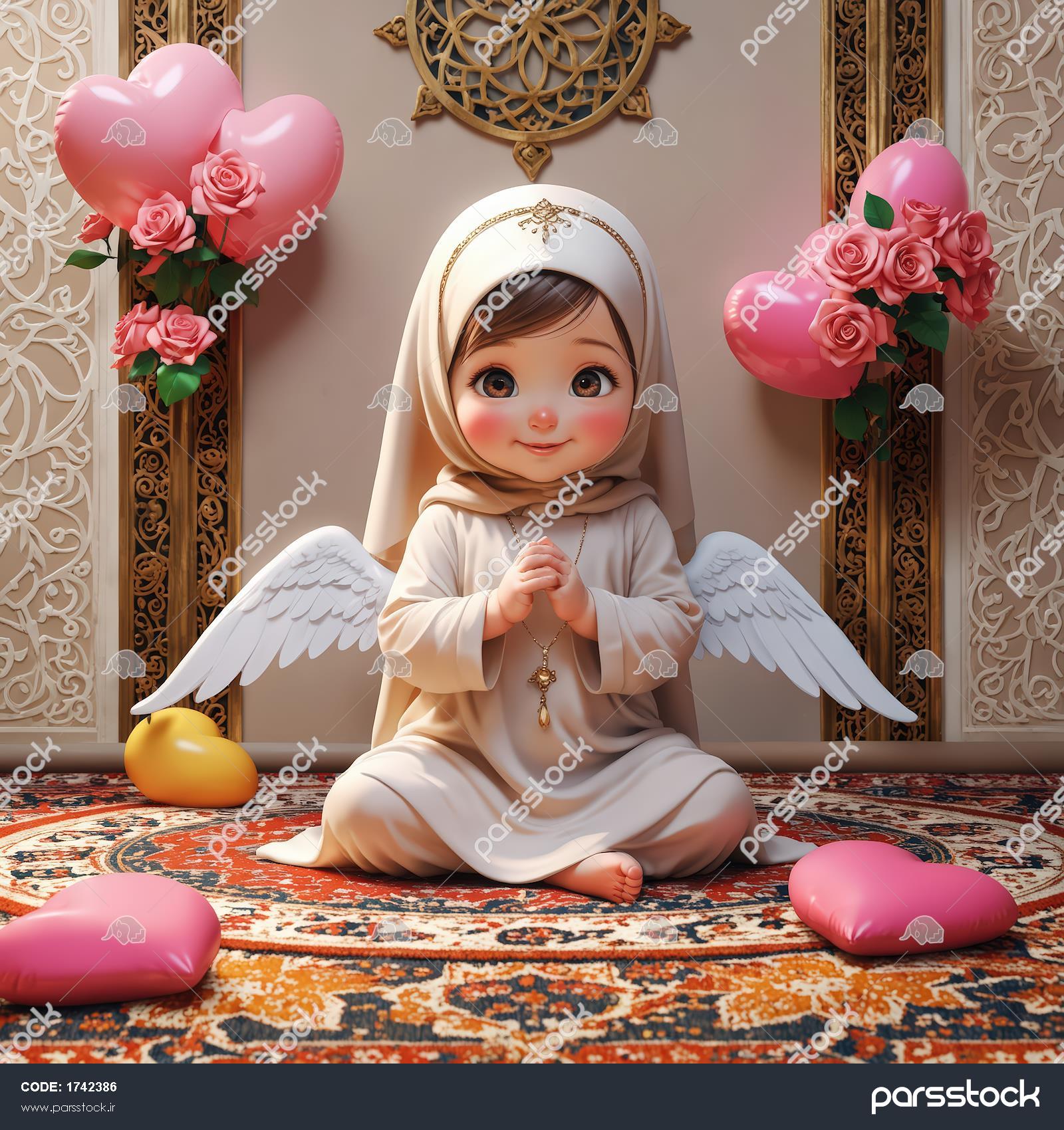 تصویر کودک فرشته‌ای با حجاب و بال‌های سفید، در احاطه گل و بادکنک قلبی و جشن تکلیف