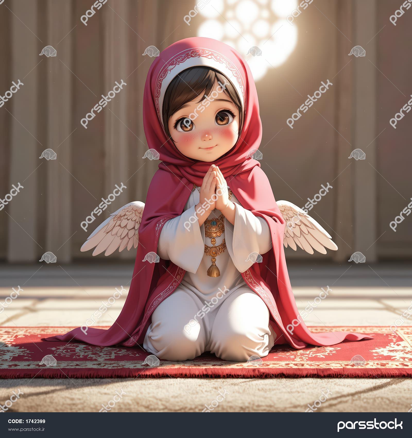 پوستر فرشته محجبه با شال قرمز، در حال نماز در محیط روشن مذهبی