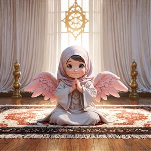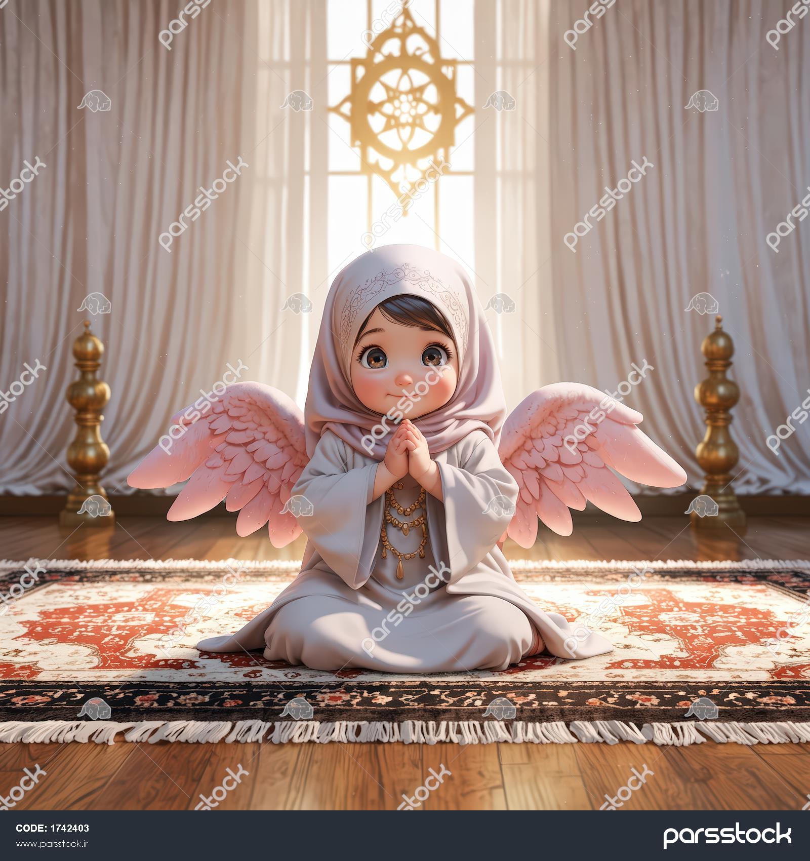 پوستر فرشته محجبه صورتی در حال نماز، مناسب چاپ تابلو و محصولات مذهبی
