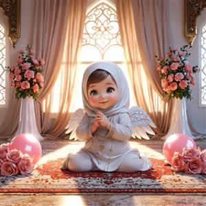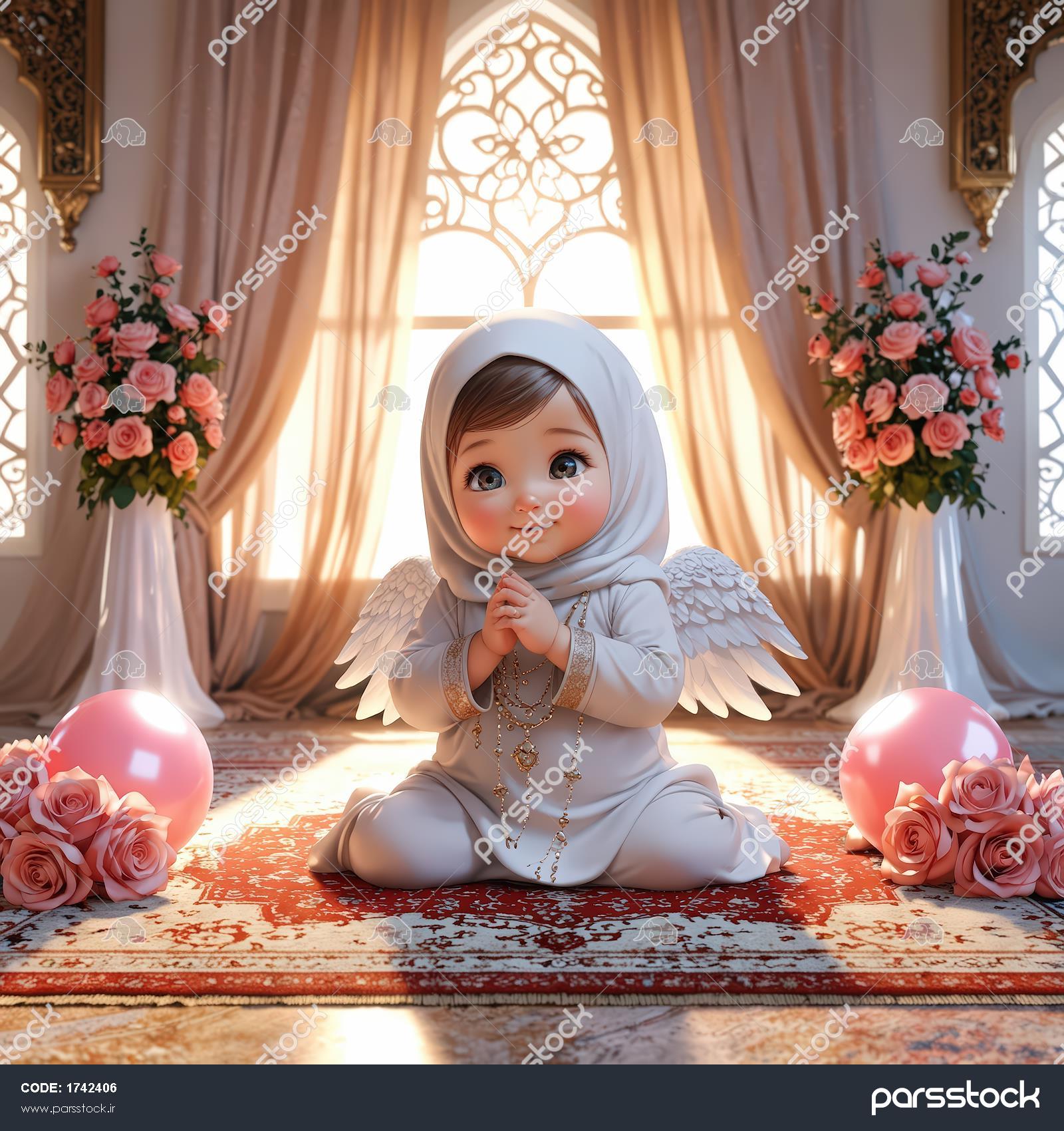 پوستر دختر محجبه فرشته با حجاب نارنجی و قلب، طرح جشن تکلیف و مذهبی طرح سهبعدی دختر جشن تکلیف با چادر صورتی و دسته گل رز در محوطه مسجد فرشته کوچک با حجاب خاکستری، گل رز و پنجرهای در جشن تکلیف طرح فرشته محجبه در حال دعا با بالهای صورتی و دکوراسیون سنتی و گل طرح سهبعدی دختر با لباس کرم و چادر بلند کالباسی در دکور جشن قلبی طرح کودک فرشته محجبه صورتی، نشسته روی قالیچه با گلدانهای گل رز تصویر باکیفیت فرشته محجبه کودک در حال دعا، مناسب چاپ تابلو جشن تکلیف تصویر کودک فرشتهای با حجاب و بالهای سفید، در احاطه گل و بادکنک قلبی و جشن تکلیف تصویر کودک با حجاب و دسته گل در جشن تکلیف با بادکنک و دکور رنگی تصویر کودک فرشتهای با حجاب، بال سفید و گل رز در جشن تکلیف نمایش همه
