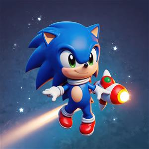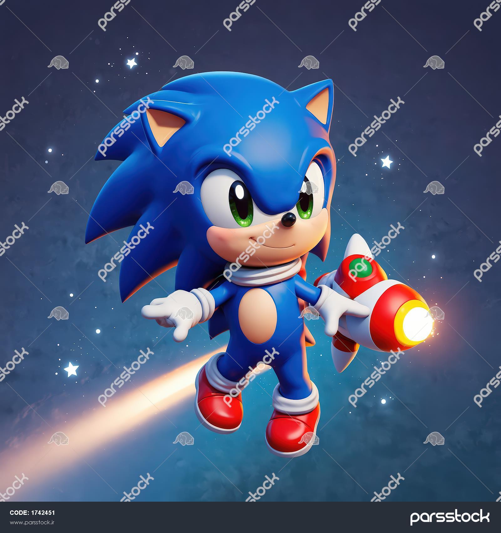 پوستر باکیفیت سونیک در حال پرواز با موشک اسباب‌بازی و پس‌زمینه کهکشان
