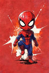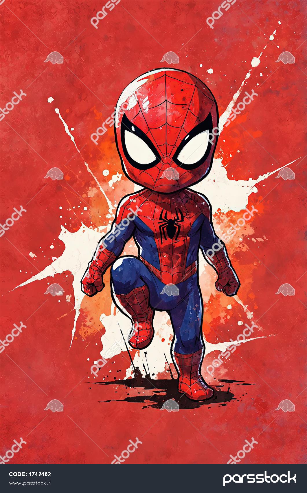تصویر چاپی مرد عنکبوتی با ژست زانو زدن در حال مبارزه با پس‌زمینه لکه رنگ قرمز برای چاپ بوم