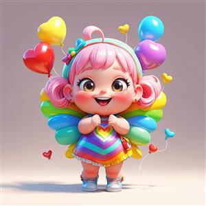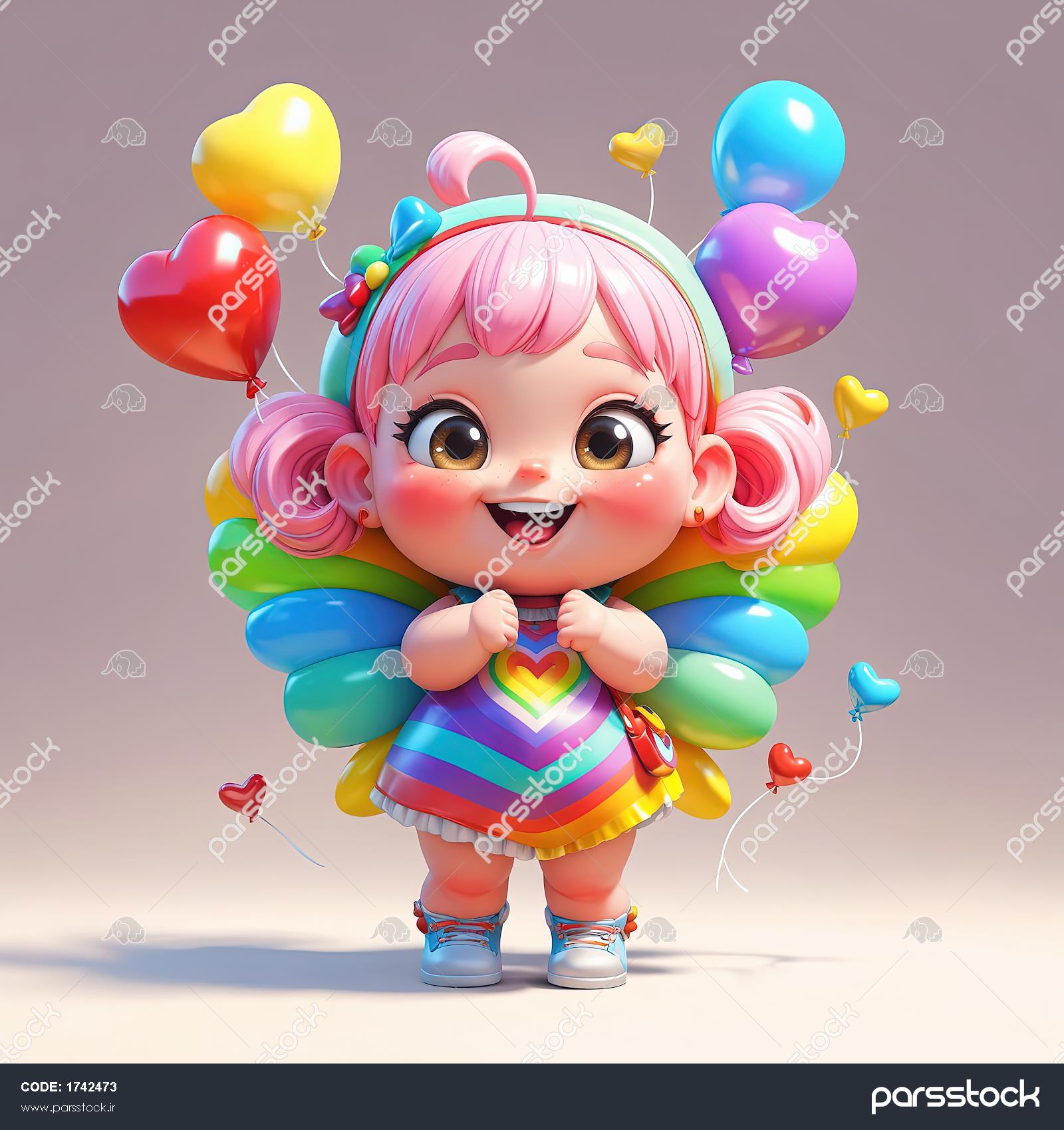 دختر بچه پرنده با بال‌های آبی و شاخک‌های صورتی، در حال پرواز با بادکنک‌های شاد