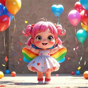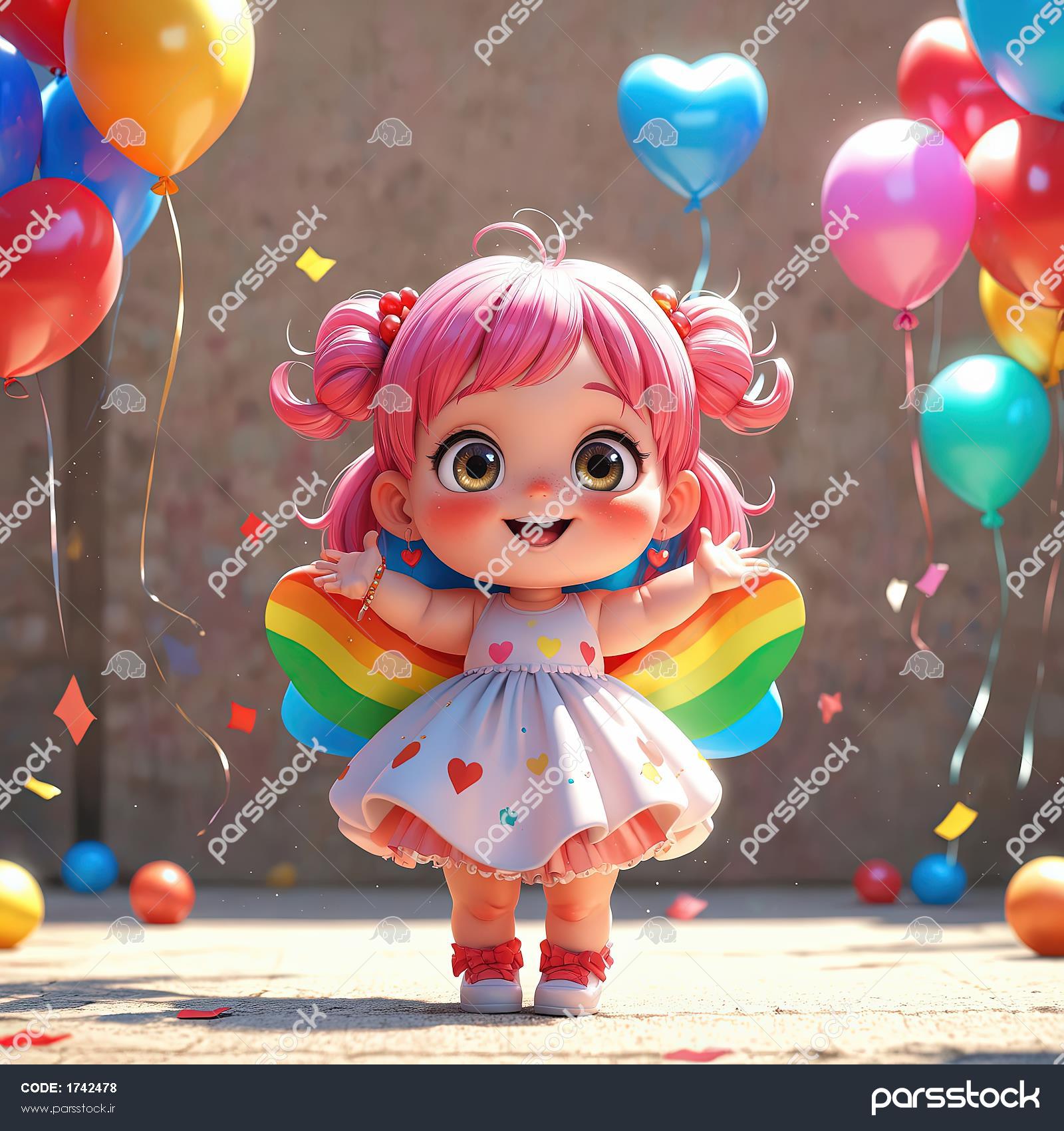 تصویر سه‌بعدی دختر بچه با موی نارنجی و لباس خالدار با بادکنک‌های قلبی شکل و ستاره
