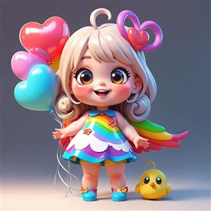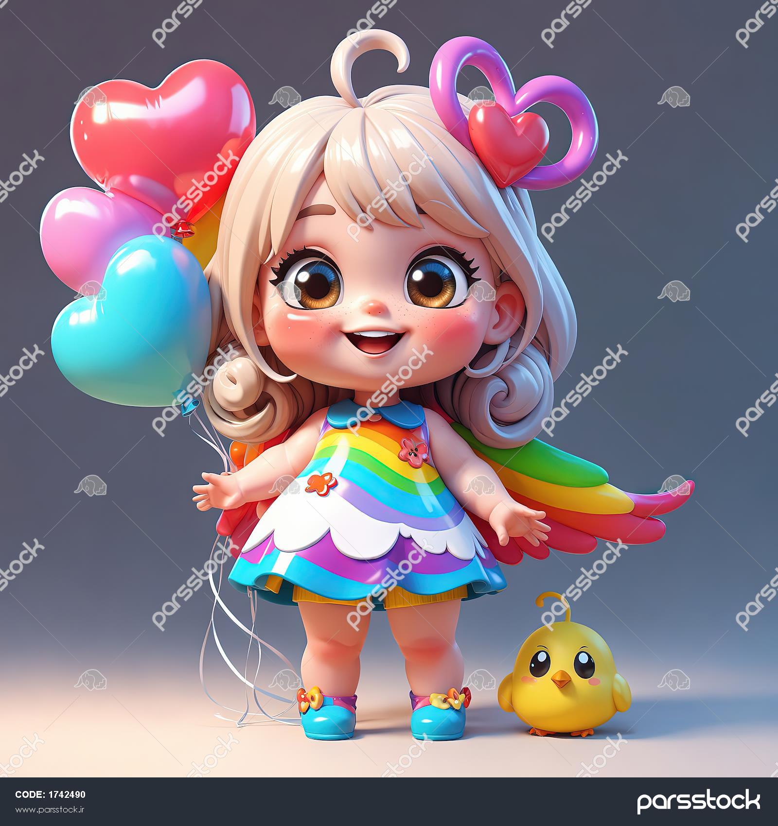 دختر فانتزی مو بلوند با بال رنگین کمانی و جوجه کارتونی کوچک، با بادکنک‌های قلبی
