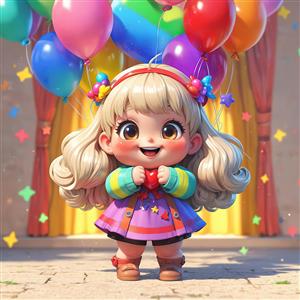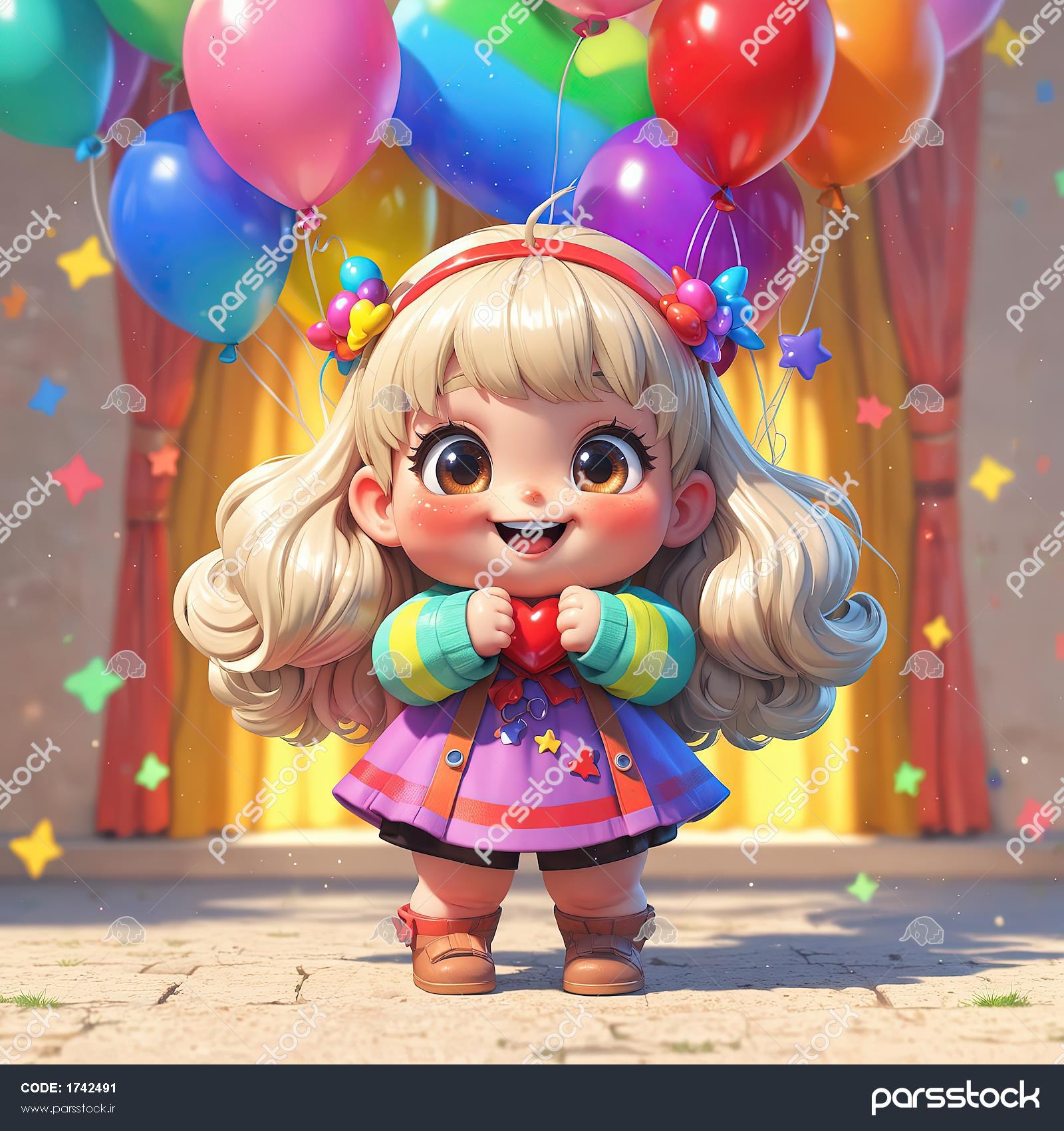 دختر کارتونی با لباس بنفش و ژاکت رنگی در محیط داخلی با پرده‌های مجلل و بادکنک