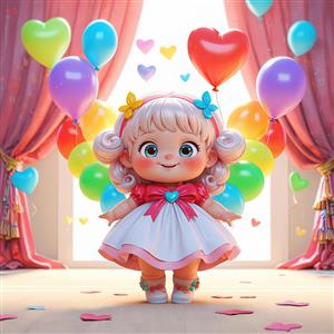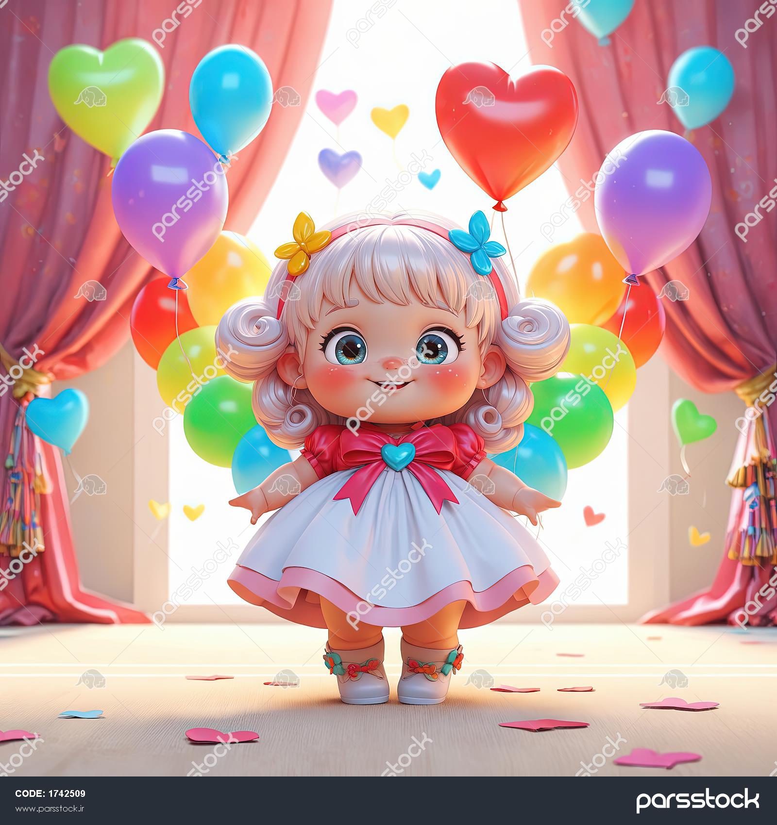 عروسک دخترانه کارتونی در اتاق جشن با بادکنک‌های رنگی، مناسب دکوراسیون و پوستر کودک