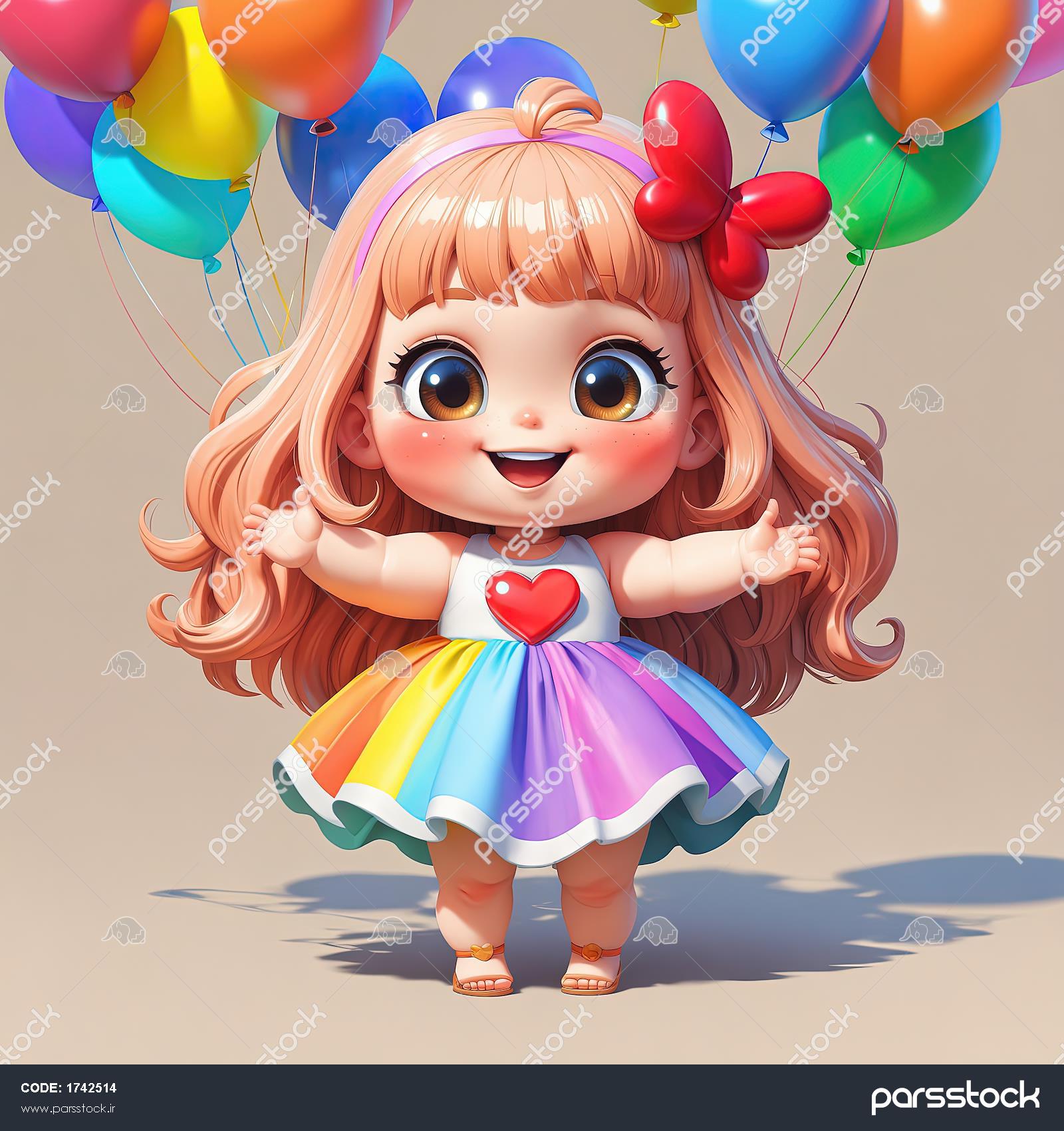 عروسک چیبی دختر شاد با دامن رنگین‌کمان و بالون‌های جشن مناسب بک‌گراند و چاپ