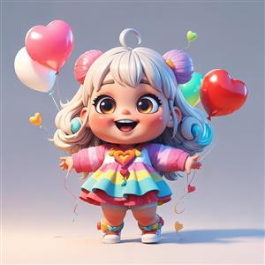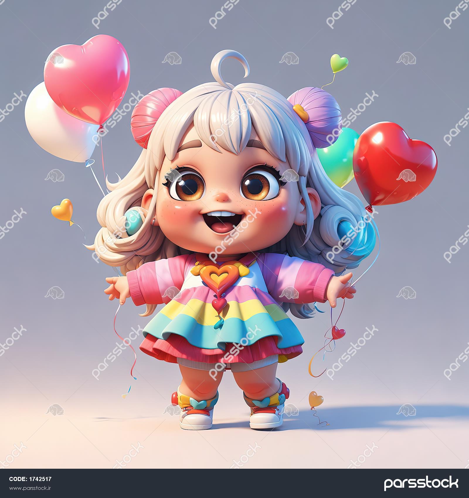 تصویر سه‌بعدی دختر بچه بامزه با بادکنک‌های قلب و لباس رنگین‌کمانی برای تابلوی اتاق کودک