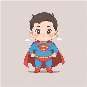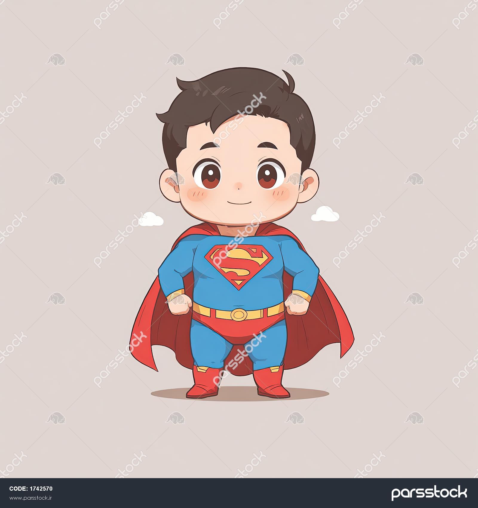 سوپرمن چیبی در پوز ابرقهرمانی با پس‌زمینه ساده، طرح مینیمال