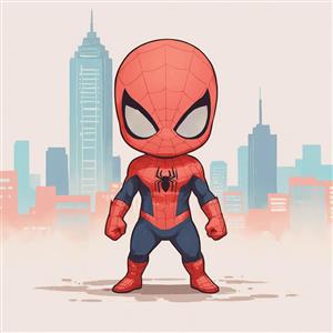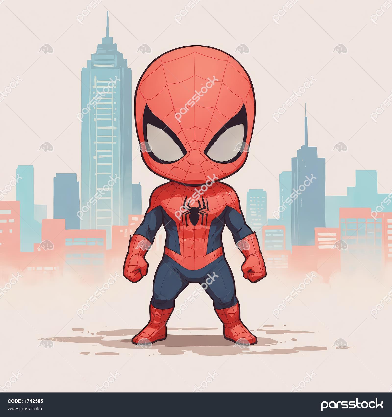 اسپایدرمن چیبی در پوز ایستاده با پس‌زمینه آسمان‌خراش‌ها، طرح دیوارکوب
