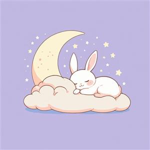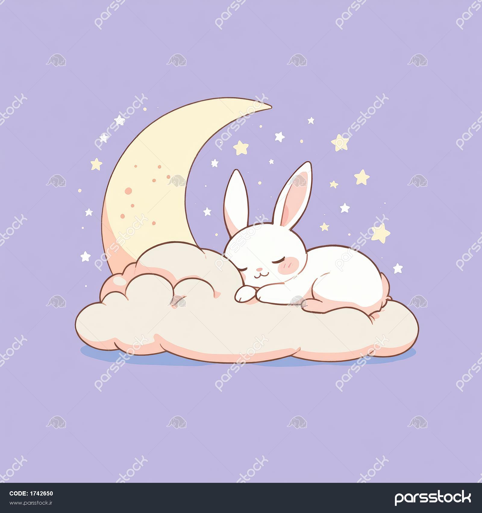 خرگوش سفید خوابیده روی ابر و ماه، وکتور فانتزی وکتور در پس‌زمینه بنفش، مناسب چاپ عریض پوستر اتاق نوزاد و کودک