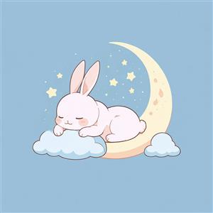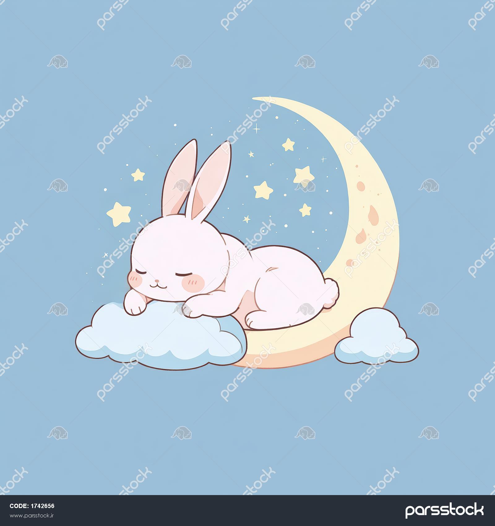 وکتور خرگوش خواب آلود روی هلال ماه، طرح کارتونی با ابر و ستاره در پس‌زمینه آبی روشن، مناسب چاپ پوستر دیواری
