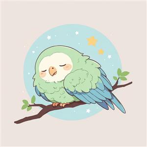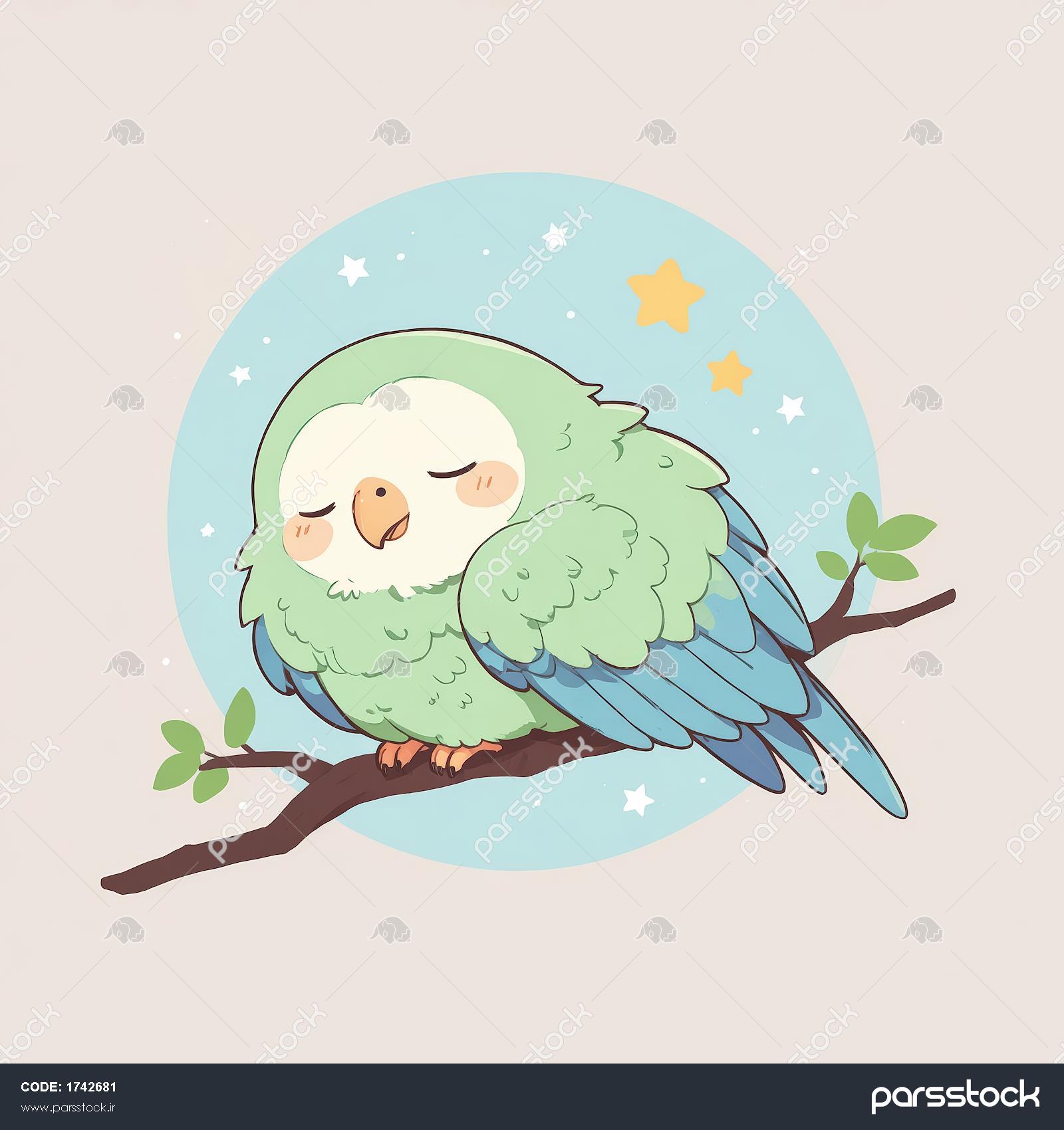 طرح کارتونی طوطی کاوایی سبز آبی خوابیده روی شاخه شب