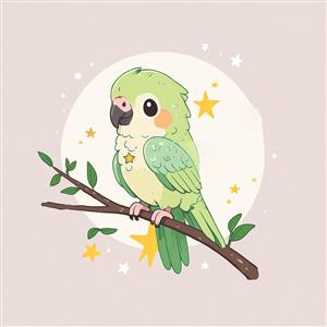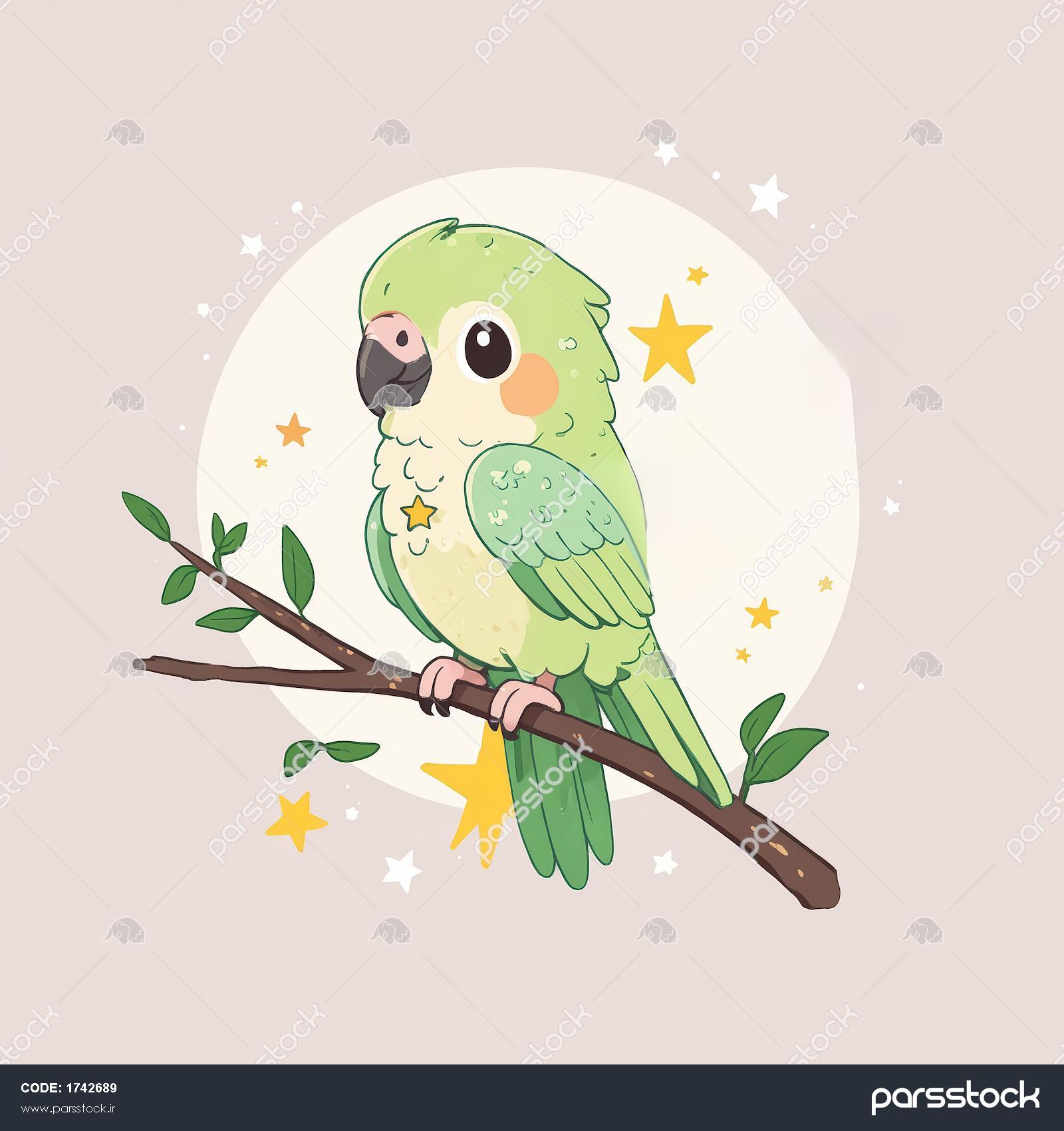 وکتور طوطی سبز رنگ فلوئورسنت روی شاخه در شب پرستاره