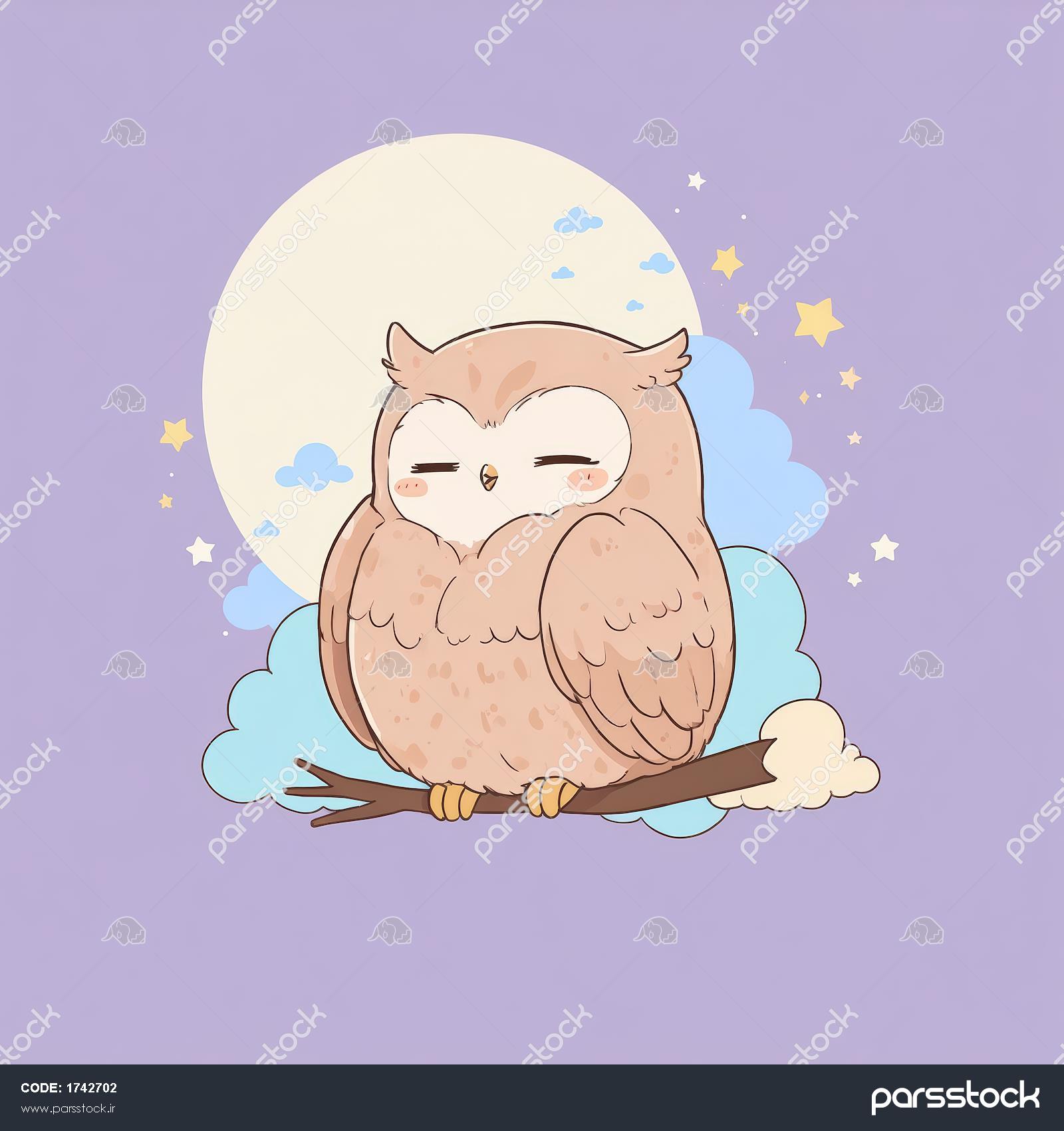وکتور جغد خوابیده کاوایی روی شاخه درخت در شب مهتابی