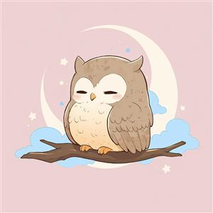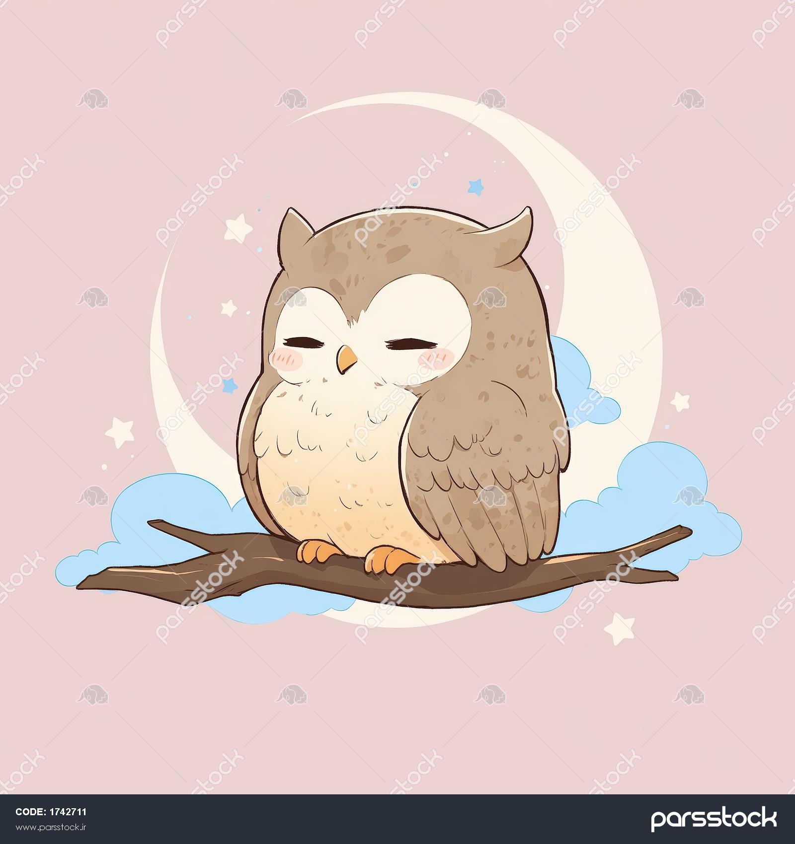 تصویر اورجینال: جغد بامزه خوابیده روی شاخه درخت زیر هلال ماه، طرح فانتزی و آرام