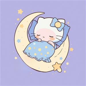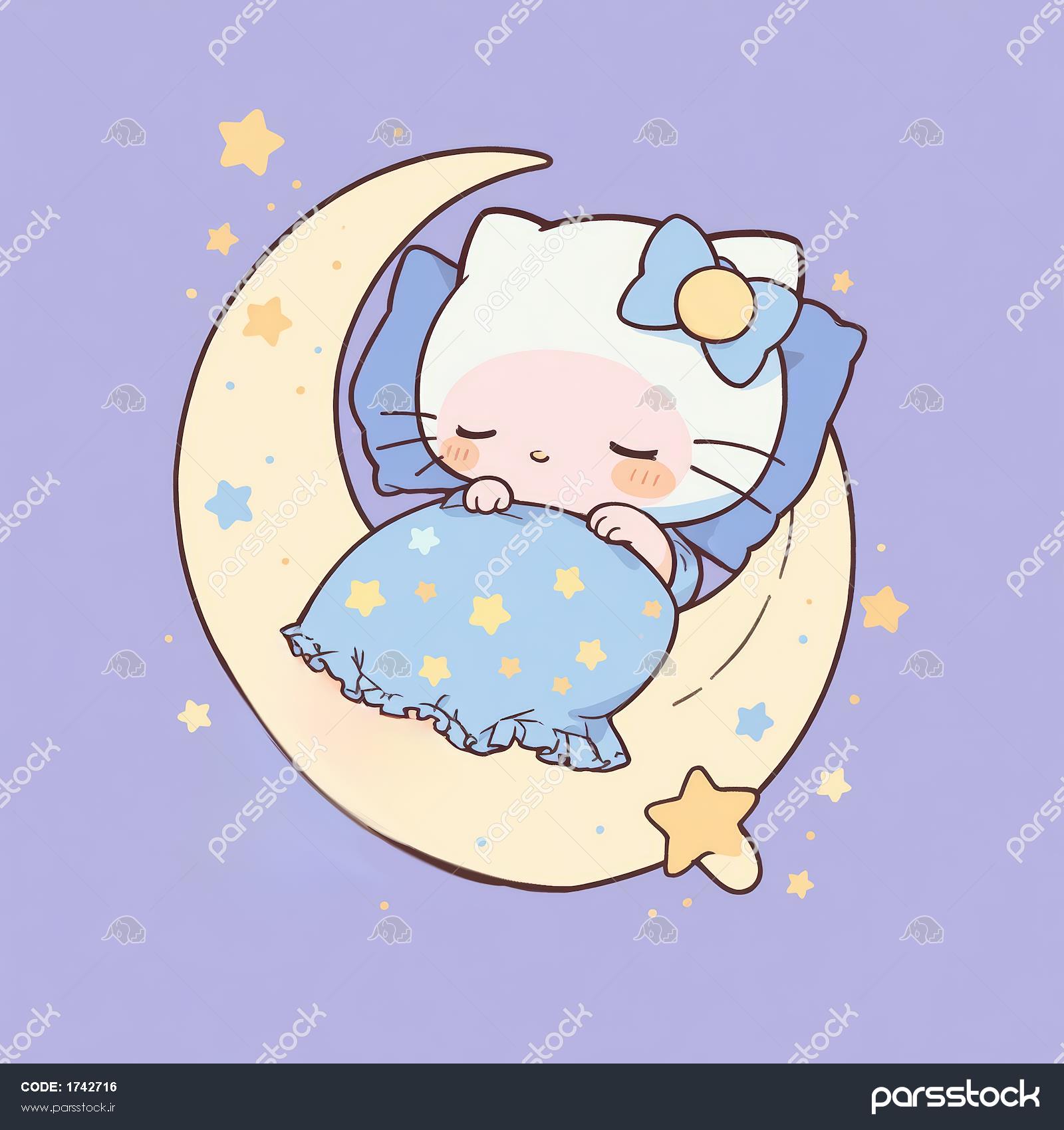 وکتور کاراکتر کیتی با لباس آبی ستاره‌دار، خوابیده روی هلال ماه زرد