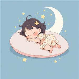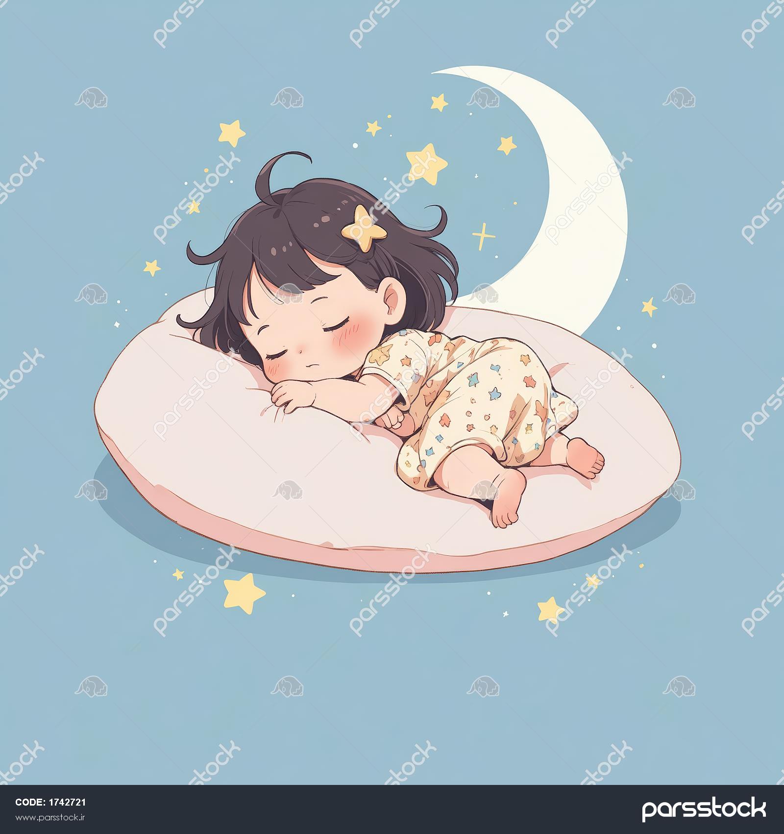 تصویر اورجینال: کودک خواب ناز روی بالشت صورتی، پس‌زمینه آبی با هلال ماه سفید