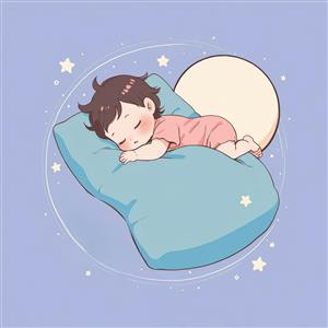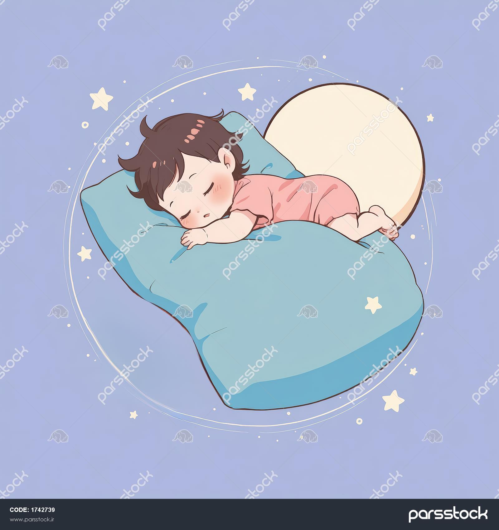 طرح مینیمال کودک خفته روی بالشت آبی و ماه کامل، مناسب چاپ مهدکودک