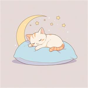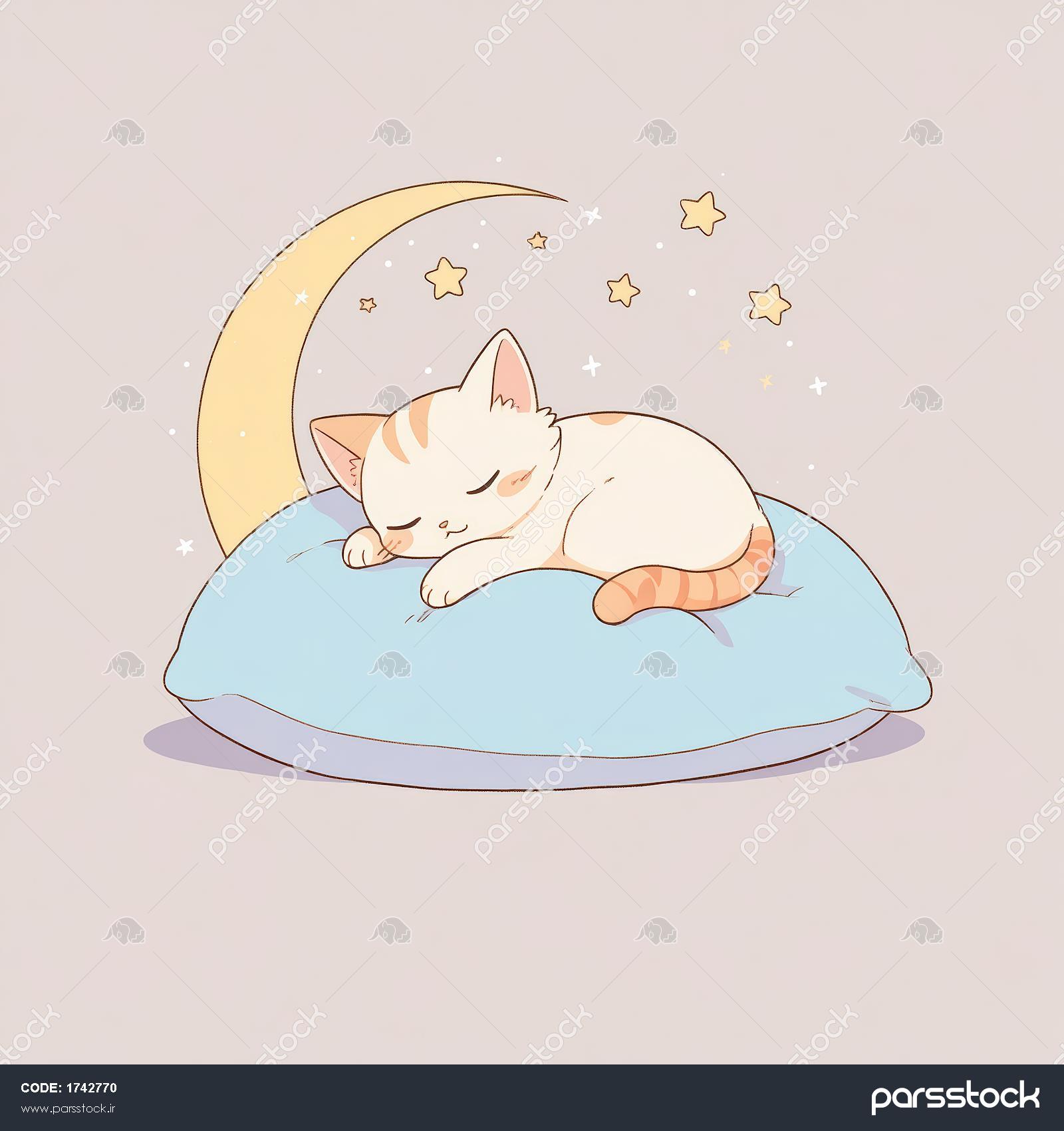 تصویر باکیفیت گربه کرم و نارنجی، خفته روی بالشت آبی زیر نور ماه و ستاره