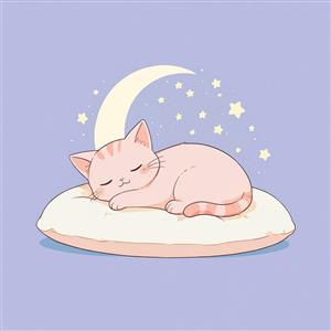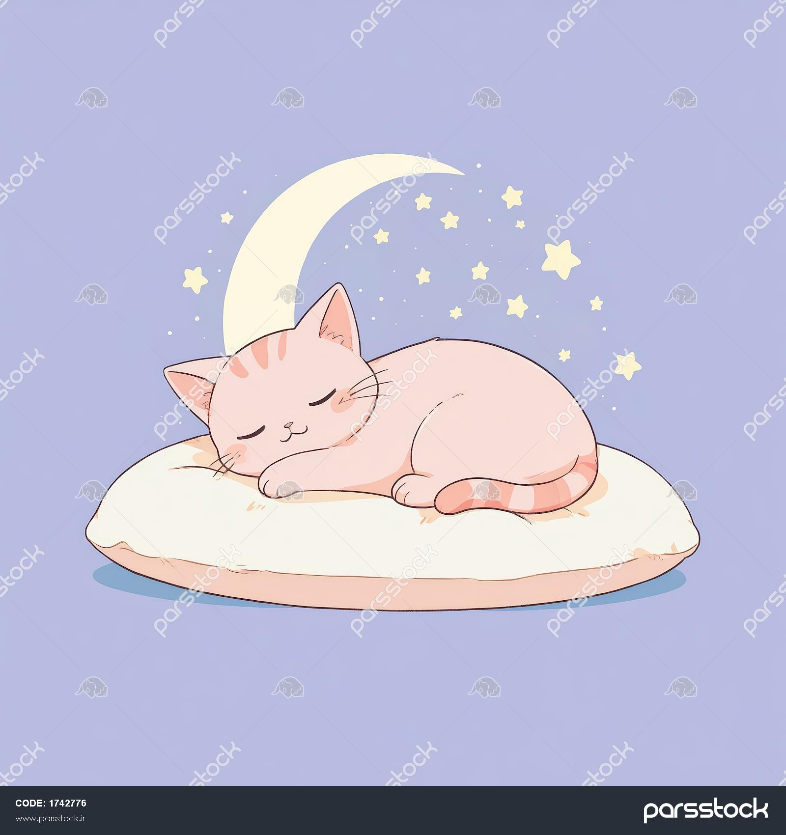 تصویر باکیفیت گربه ناز خوابیده روی بالشتک بژ در شب مهتابی و بنفش
