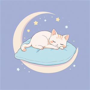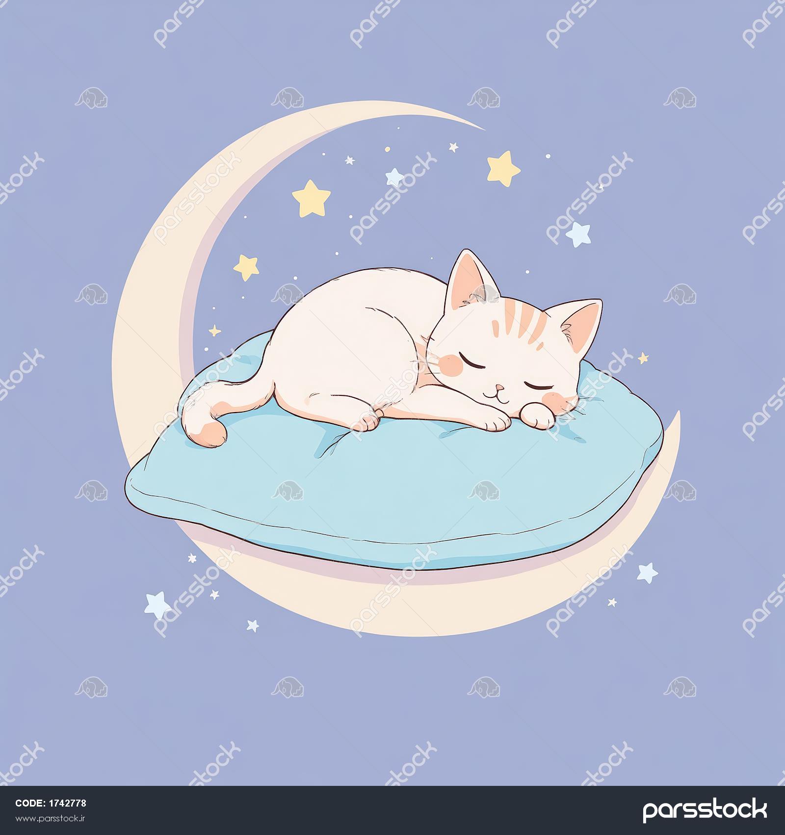 نقاشی دیجیتال گربه ناز در آغوش ماه و ستاره‌ها، خوابیده روی بالشت آبی