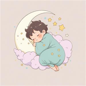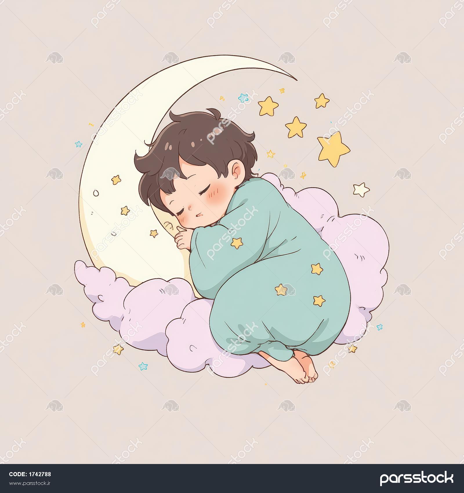 نوزاد خوابیده بین ابرها و ماه هلالی (تم شب و رؤیا) با لباس ستاره‌دار