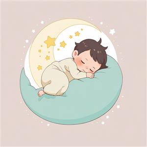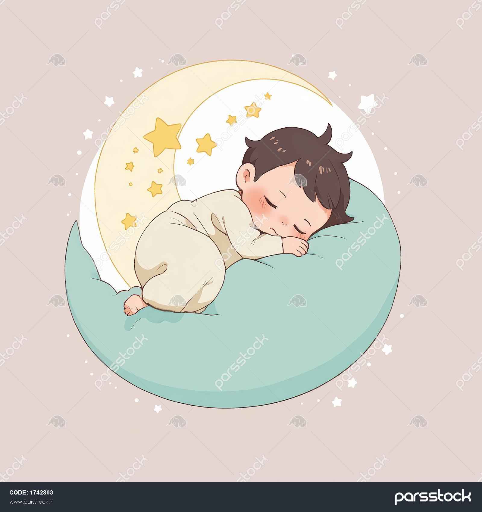 تصویر فانتزی نوزاد خوابیده روی ماه و بالشت، با ستاره‌ها (وکتور کودک و رؤیایی)