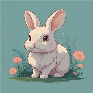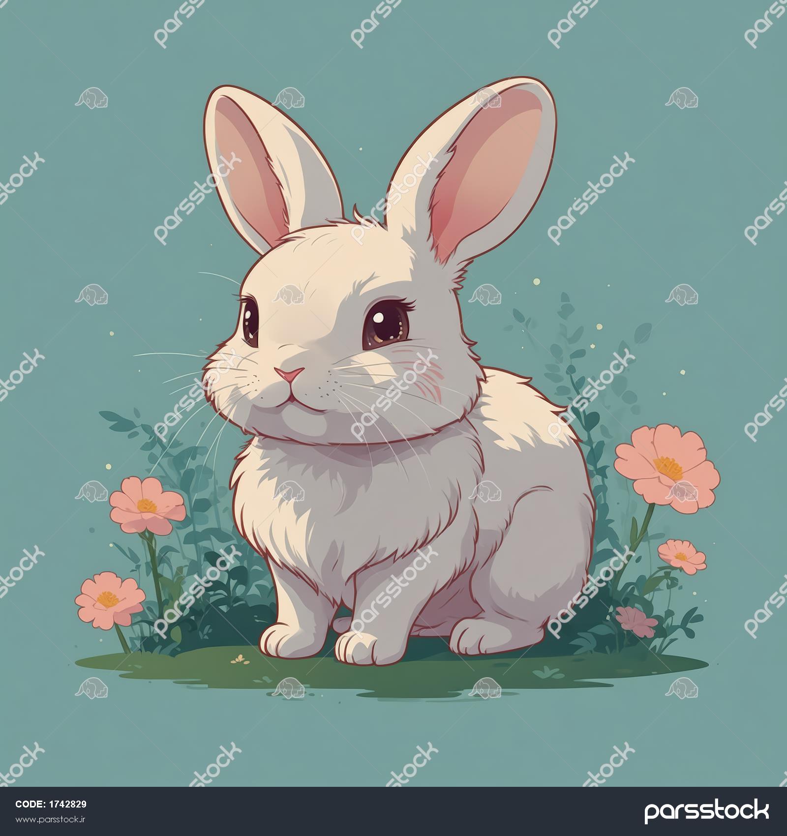 تصویر اورجینال خرگوش نشسته با پس‌زمینه سبز و گل‌های نارنجی (فصل بهار)
